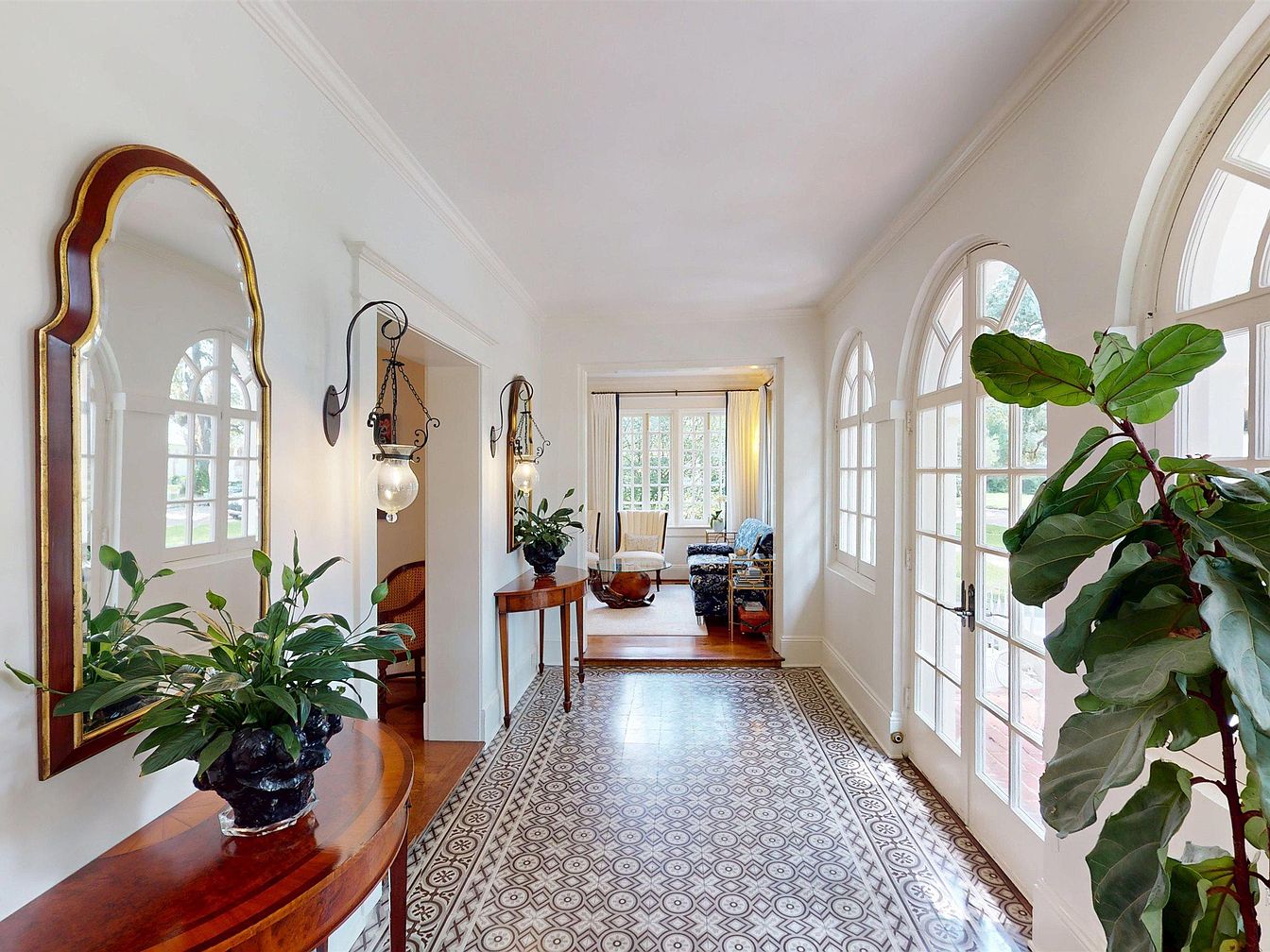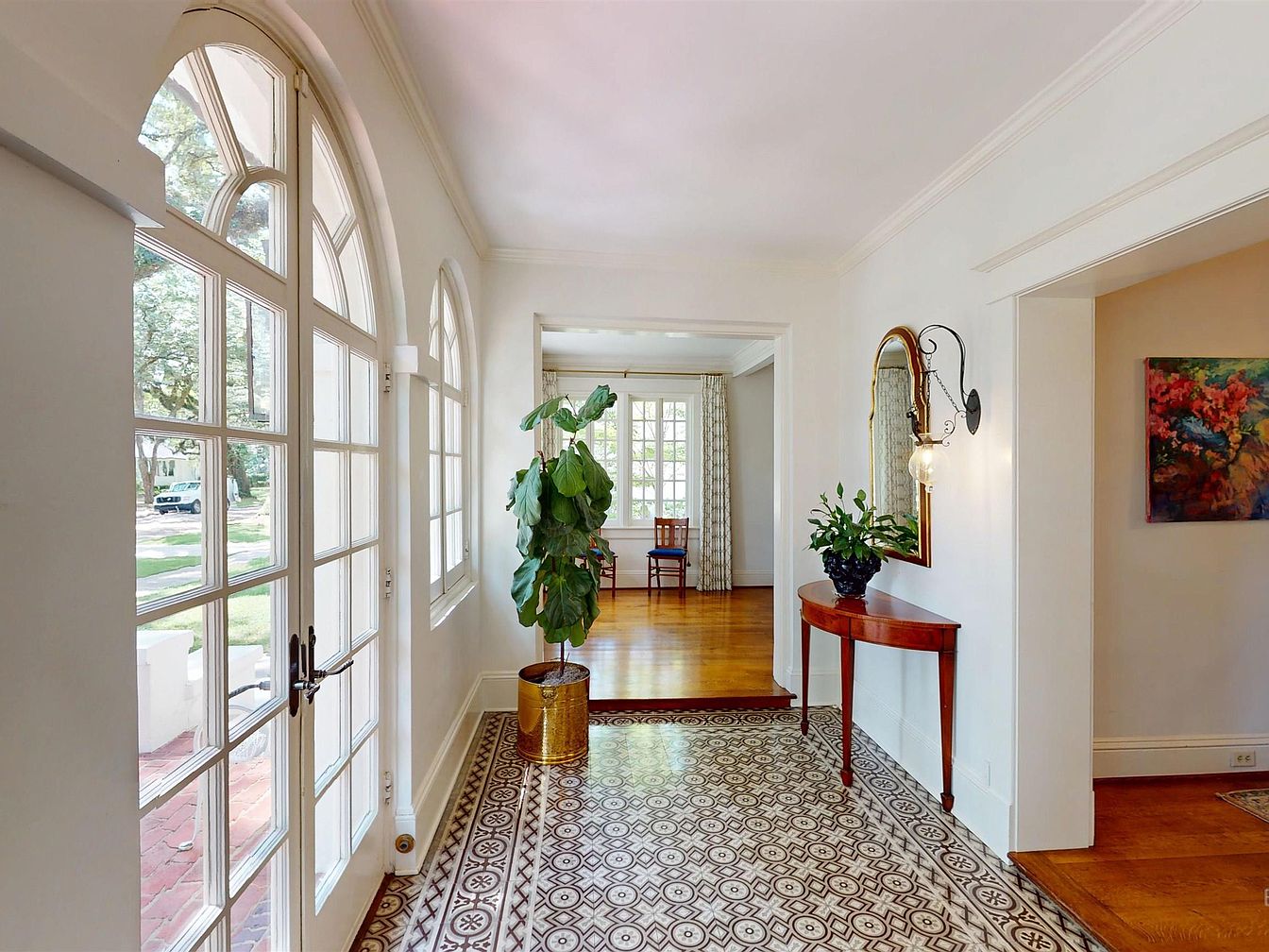 The entryway features elegant arched windows that allow natural light to illuminate the space, highlighting its warm, inviting atmosphere. The walls are painted in a soft white, complementing the intricate patterned tile flooring that combines earthy tones and geometric designs. Foliage from a lush green plant nestled in a gold pot adds a touch of nature, while a narrow, polished wooden console table showcases an ornamental mirror and a simple vase filled with greenery. The room flows seamlessly into an adjacent space through a wide doorway, enhancing the open layout and inviting a sense of continuity throughout.
