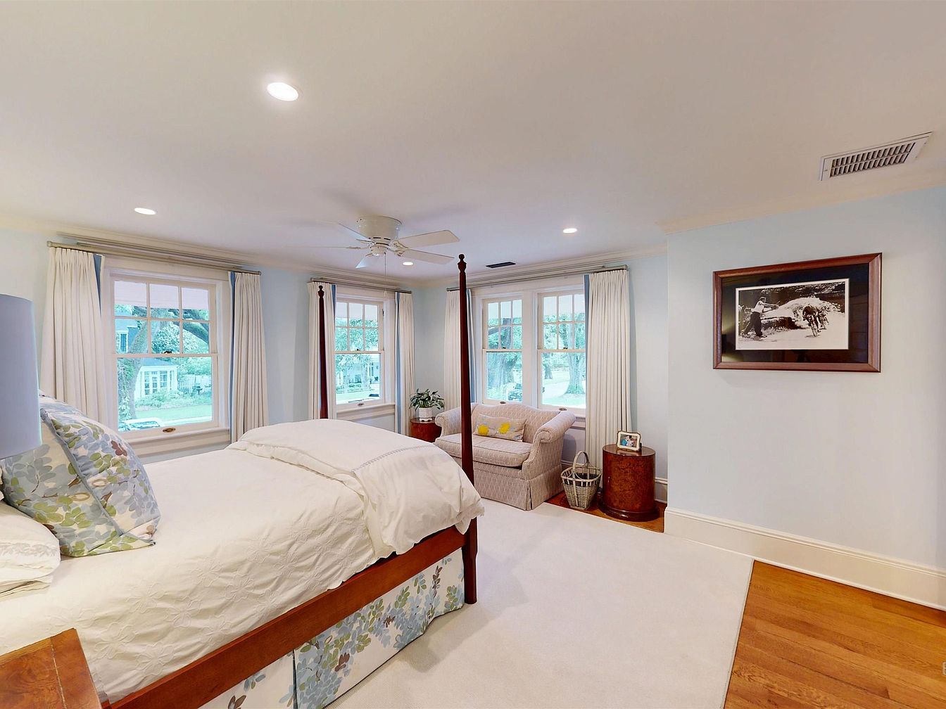 A serene bedroom featuring a four-poster bed adorned with a floral-patterned bed skirt, complemented by light bedding. Two large windows framed by soft white drapes allow natural light to flood the space, offering views of the outdoors. Opposite the bed is a cozy seating area with a light-colored upholstered chair and a small side table, enhancing the inviting ambiance. The walls are painted in a subtle blue hue, adding a tranquil feel, while polished wooden flooring provides warmth. A framed black-and-white photograph decorates the wall, blending vintage charm with the room’s contemporary elements.