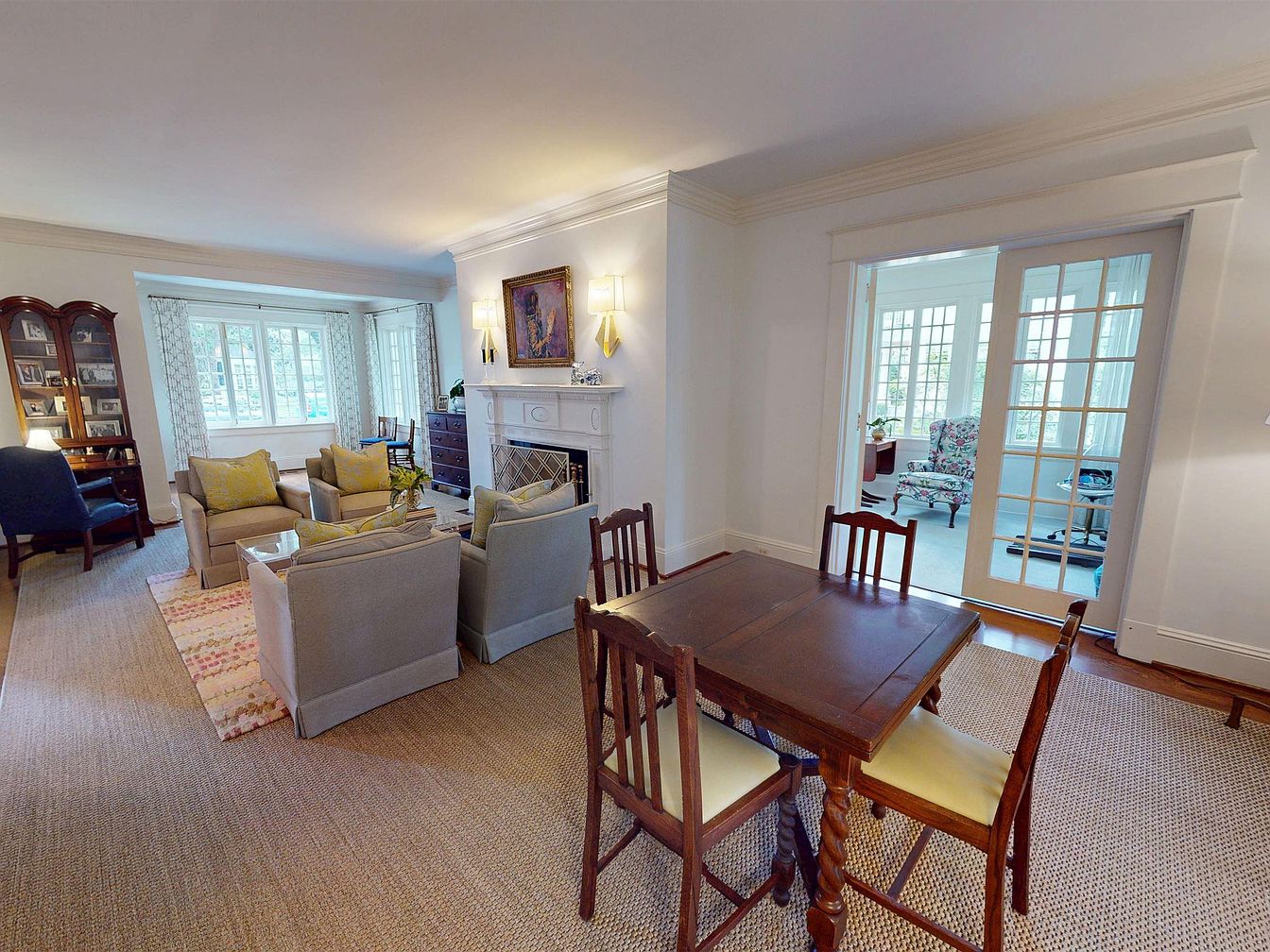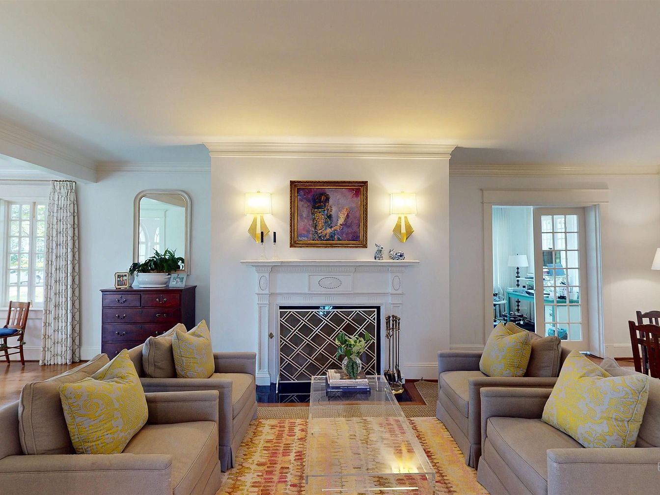 This living room features a cozy arrangement of furniture, dominated by light gray armchairs adorned with yellow cushions, creating a welcoming atmosphere. A rustic wooden table and chairs sit nearby, enhancing the room’s warmth. The fireplace, framed by elegant trim, is complemented by a vibrant piece of artwork above it. Large windows draped in soft, patterned curtains invite natural light, illuminating the space. Nearby, a glass cabinet displays family photos, adding personal touches. The floor is covered with a textured, neutral-toned rug, while doorways lead to a sunlit area, suggesting an inviting transition to the outdoors.