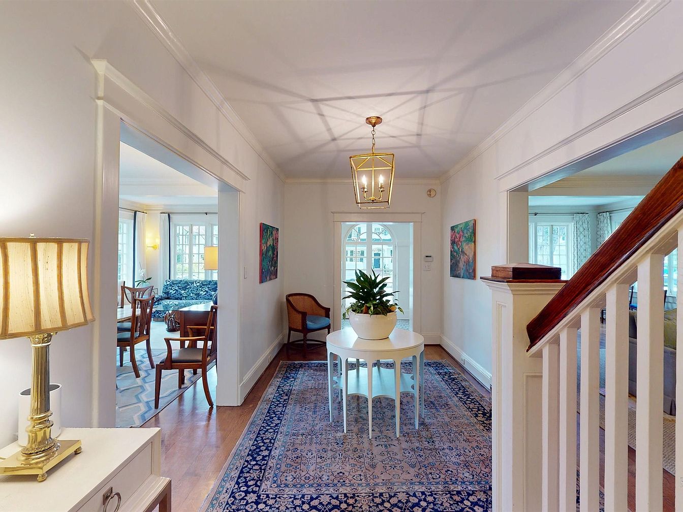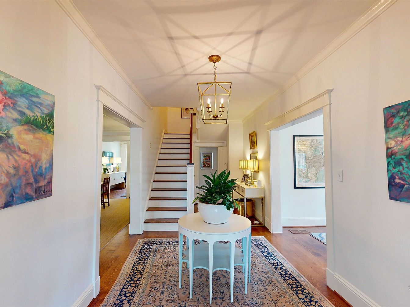 The entryway features a warm, inviting atmosphere with light cream walls and rich wooden flooring. A white table with curved legs holds a lush green plant, providing a fresh touch to the space. Above, a geometric brass light fixture casts intricate shadows across the ceiling. Two vibrant paintings adorn the walls, adding pops of color with blues and pinks. A patterned area rug runs the length of the hallway, accentuating the traditional charm. On the left, a doorway leads to a cozy living area, while a wooden staircase ascends, framed by subtle molding, hinting at the home’s historical elegance.