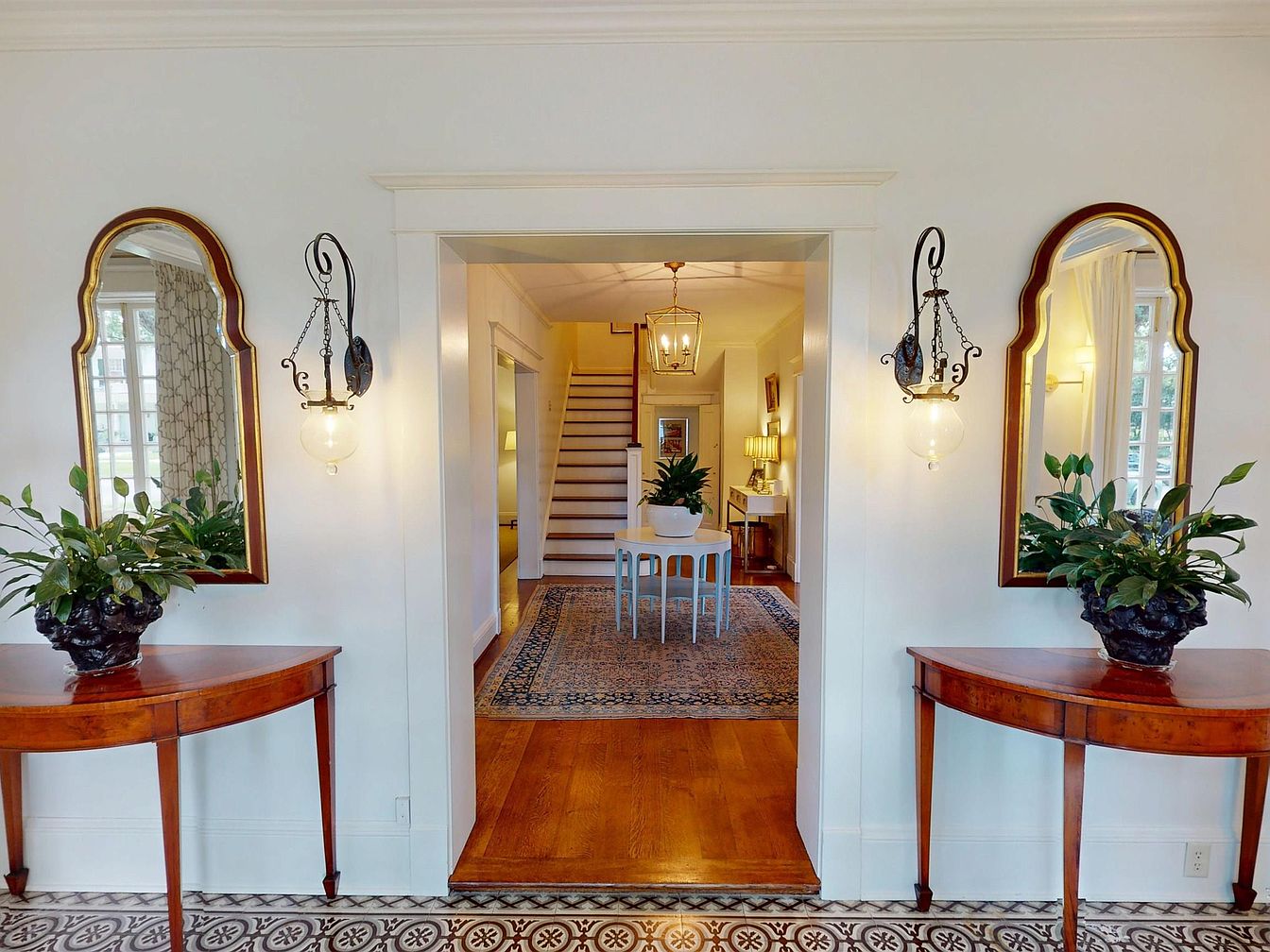 The entryway features elegant elements, highlighted by two exquisite mirrors with ornate gold frames. Flanking each mirror are decorative sconces, casting a warm glow. Rich wooden console tables add sophistication, complemented by lush green plants in dark ceramic pots. The patterned tile flooring, showcasing intricate designs, contrasts beautifully with the polished wood of the floor leading into the home. A glimpse of the dining area is visible through the archway, featuring light blue furniture and a subtle area rug that ties the space together. The overall color scheme balances light neutrals and earthy tones, creating a welcoming atmosphere.