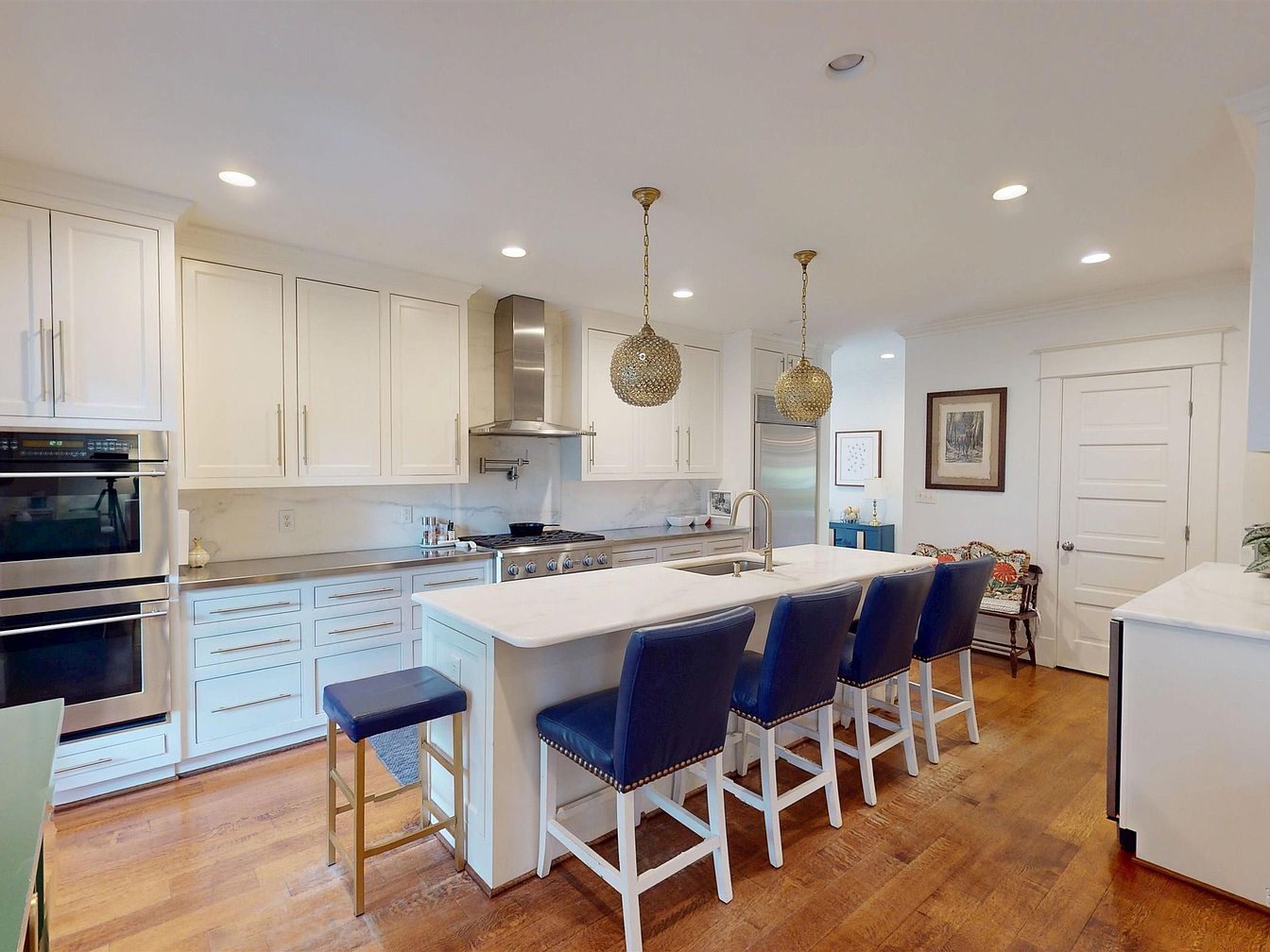 This kitchen features a modern layout with a central island boasting a sleek, white countertop. Surrounding the island are high-backed navy blue stools with gold accents, adding a touch of elegance. Cabinets above and below are finished in pristine white, creating a clean aesthetic. Stainless steel appliances, including a double oven and a gas range, complement the minimalist design. Subtle recessed lighting and two decorative pendant lights enhance brightness and style. A beautiful wood floor provides warmth, while the marble backsplash gives a luxurious feel. The overall color scheme combines white, navy, and warm wood tones.