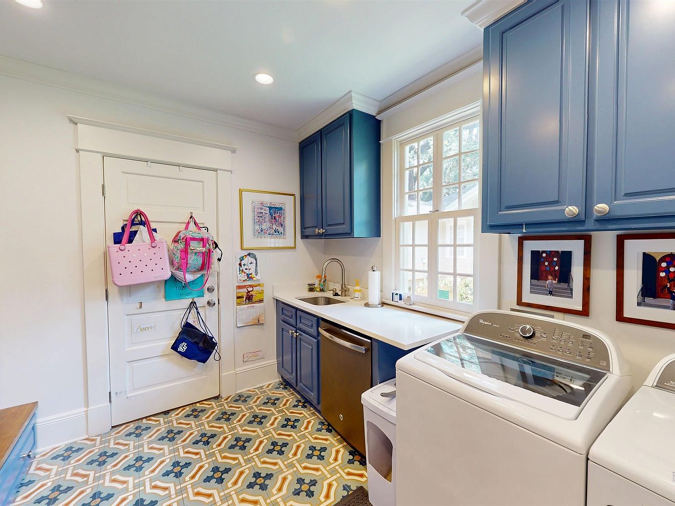 The laundry room blends functionality with style, featuring vibrant blue cabinetry that contrasts beautifully with the light countertops. Vintage-inspired patterned tiles in shades of blue, orange, and white add a playful touch to the floor. A large window enhances natural light, creating a bright atmosphere. The space is organized, with colorful bags hanging by the door and framed artwork adding personality. Appliances, including a washer and dryer, are discreetly integrated, maintaining a clean look. Architectural details such as crown molding contribute to the home’s historic charm, making this laundry area both efficient and visually appealing.