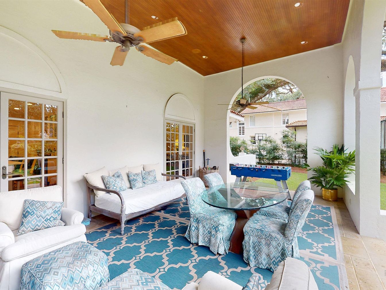 This outdoor patio features a spacious layout with textured stone flooring, providing a warm and welcoming ambiance. The ceiling showcases rich wood paneling, contributing a touch of elegance. A large glass dining table occupies the center, surrounded by upholstered chairs displaying playful patterns in hues of blue. A plush white sofa adorned with decorative pillows complements the color scheme, while a matching ottoman enhances comfort. Natural light floods through arched entryways, offering views of the lush greenery outside. A ceiling fan circulates the air, making this space perfect for relaxation and gatherings.