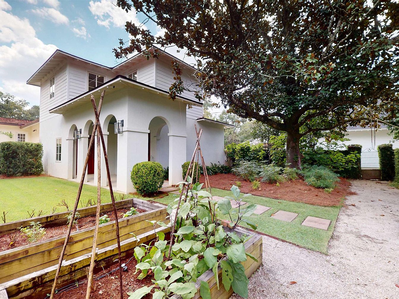 A charming garden area showcases lush greenery, highlighted by a large magnolia tree providing ample shade. The house features a light-colored facade with striking arched doorways, lending a welcoming vibe. In the foreground, wooden planter boxes display a variety of plants, indicating a space devoted to gardening. Pathway stones lead gracefully through the scene, connecting the garden and the home. Neatly trimmed hedges frame the property, adding to the cultivated aesthetic. The grass is well-manicured, creating a balanced contrast with the earthy tones of the mulch and the vibrant greens of the plants.