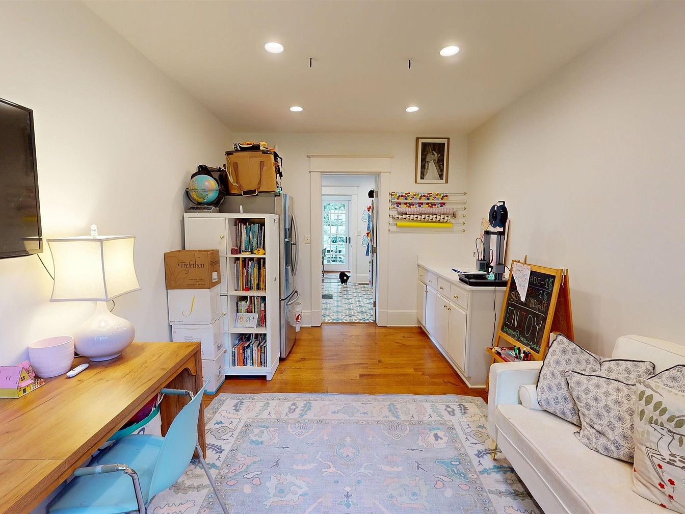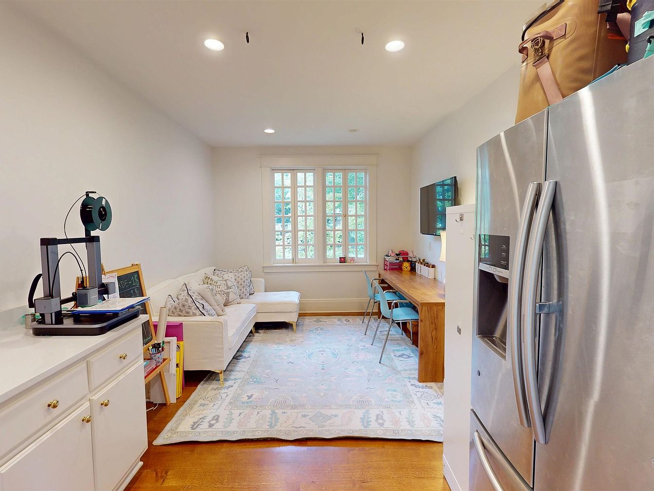 A cozy home office space features a light color scheme with soft white walls and rich wooden floors. A white sectional sofa adorned with decorative pillows provides a comfortable seating area. A modern desk made of warm wood is complemented by sleek pastel blue chairs, creating an inviting workspace. On the left, a 3D printer and small chalkboard add an innovative touch. A large, stainless steel refrigerator stands against the right wall, enhancing functionality. Natural light floods through multiple panes of window, bringing a fresh and airy ambiance to the room, while intricate area rugs add texture.