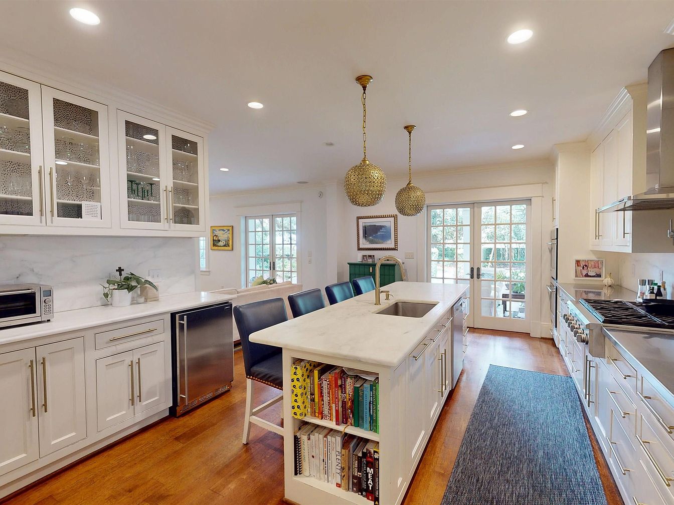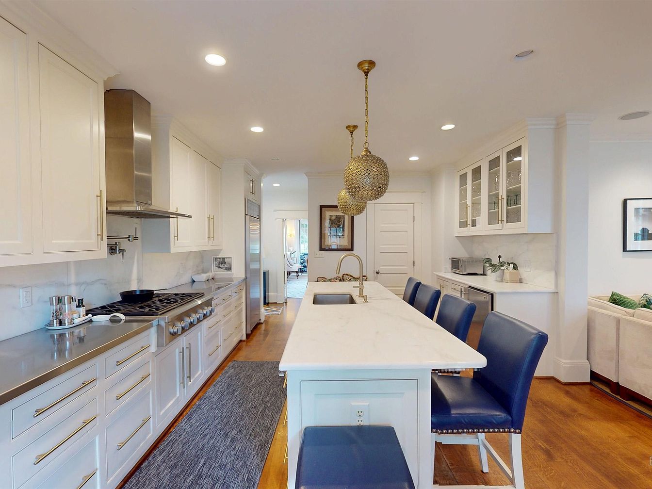 This kitchen features a long, elegant island anchored by white marble with subtle gray veining, combined with a polished stainless steel countertop on the side. Navy blue upholstered barstools with silver nailhead trim provide seating, contrasting beautifully against the light cabinetry. Golden pendant lights hang above, adding warmth and a touch of sophistication. The cabinetry showcases polished hardware and a classic design, creating a timeless aesthetic. The spacious layout allows for smooth movement, and large windows offer natural light, enhancing the inviting atmosphere. Stylish details like the framed artwork and leafy greens contribute to the vibrant, contemporary ambiance.