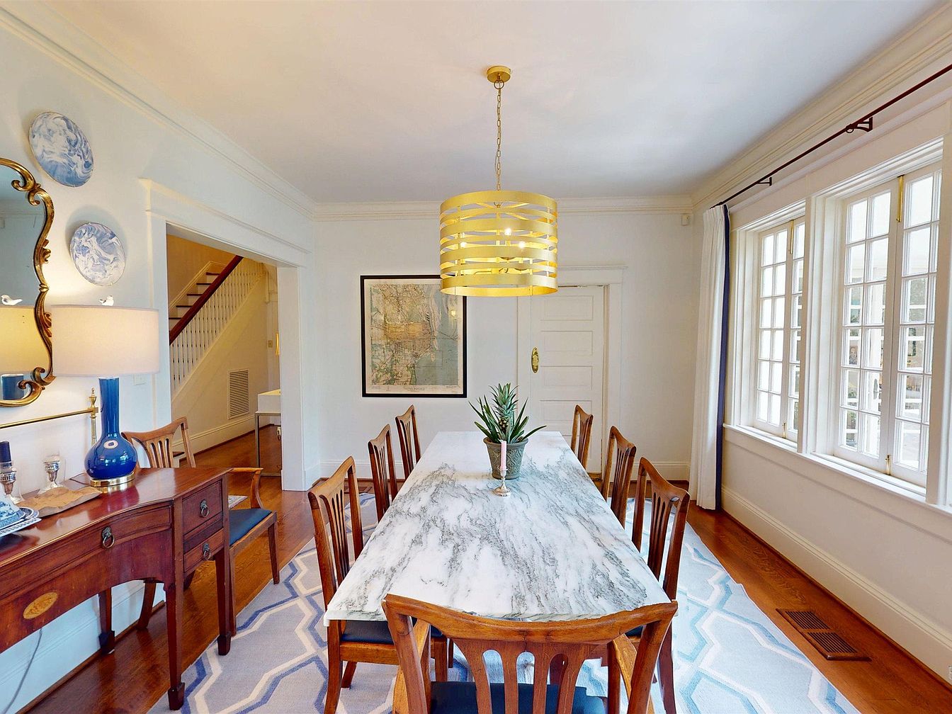 This dining room features a long, elegant table with a striking marble top supported by rich wooden legs. Surrounding the table, there are eight wooden chairs with dark cushions, offering a classic touch to the warm, inviting atmosphere. A unique yellow pendant light hangs centrally, casting a soft glow across the room. The walls are painted in a light hue, complemented by decorative blue plates and an ornate mirror above a wooden sideboard. Natural light floods in from multiple windows, framed by dark curtains, enhancing the room’s airy feel. An intricate patterned rug underlines the space.