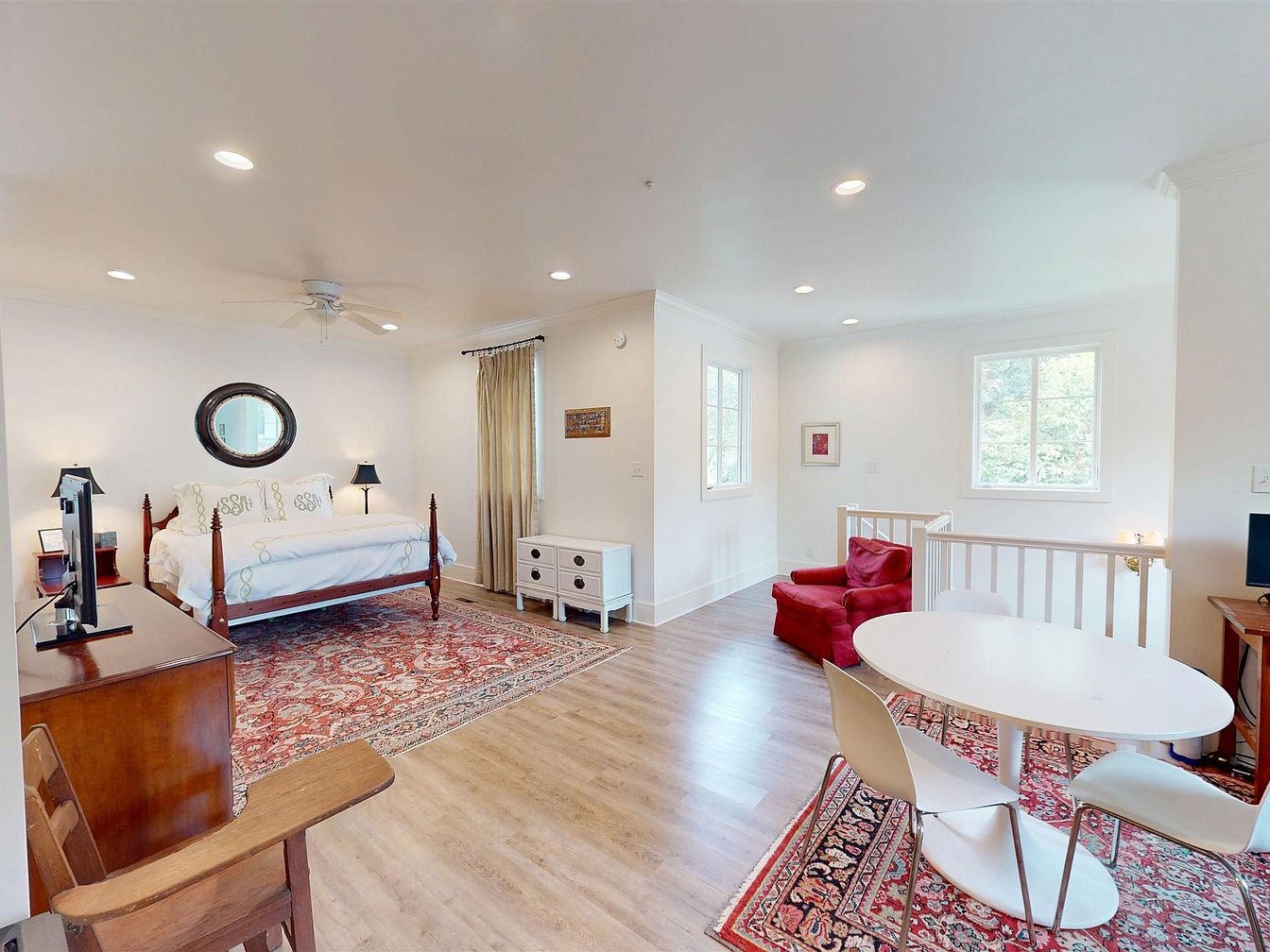 A spacious bedroom featuring a prominent four-poster bed with detailed wooden posts, adorned with decorative pillows. The color palette is soothing, with light walls that enhance the natural light flowing through multiple windows. A plush area rug in rich reds and intricate patterns adds warmth beneath the bed. Beside the bed, minimalist nightstands with matching lamps provide soft lighting. A small white table and chairs in the corner invite casual dining or work. The room is complemented by a vintage dresser and a modern TV, striking a balance between classic and contemporary design elements.