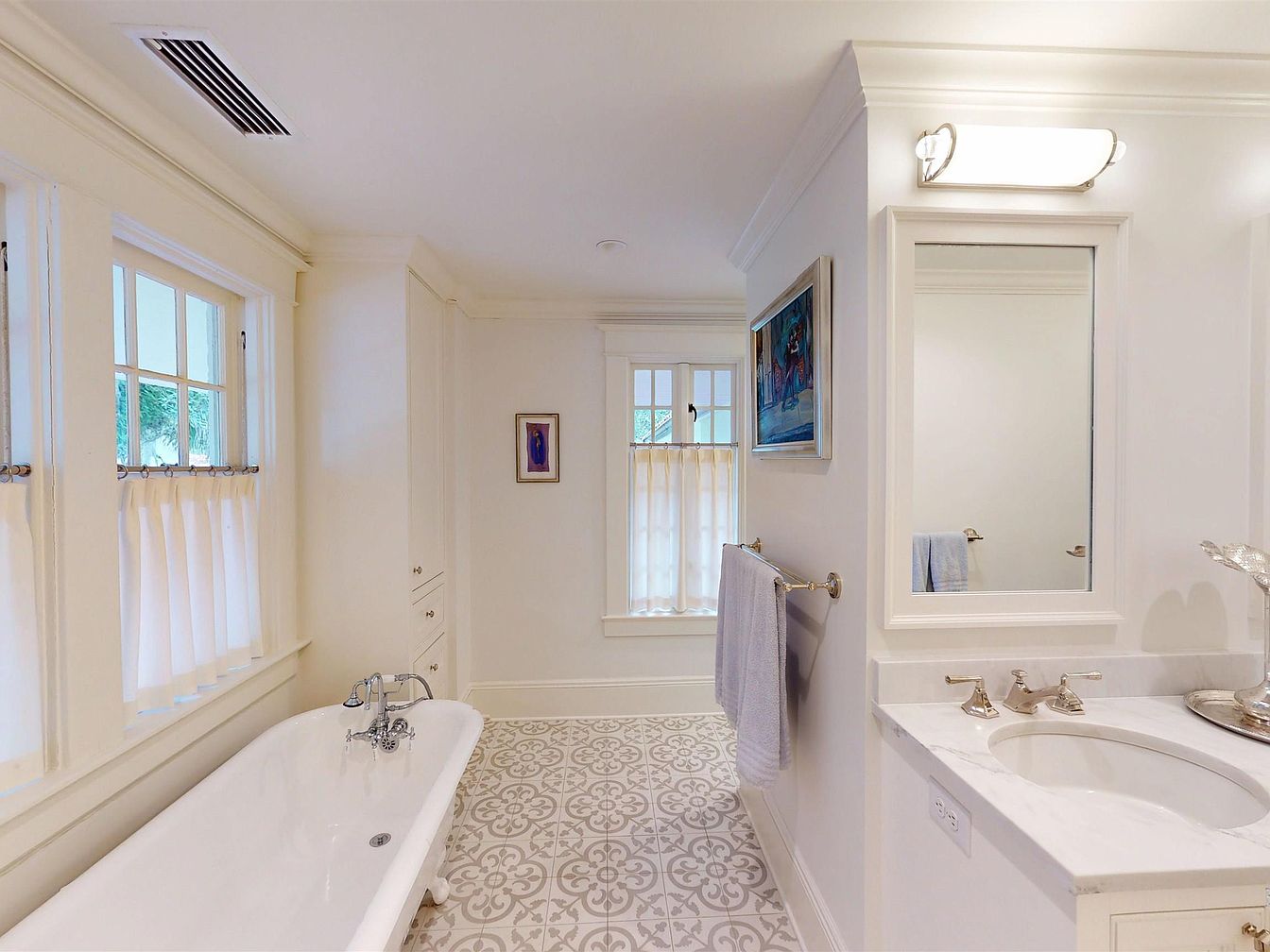 This serene bathroom features a classic clawfoot tub positioned beside elegantly framed windows adorned with sheer white curtains, allowing natural light to filter in softly. A subtle color palette of pale beige and white creates a soothing atmosphere. Decorative elements include light gray patterned tiles that add character to the floor, paired with polished chrome fixtures that complement the marble vanity. The wall-mounted mirror reflects the organized space, enhancing its openness. Elegant accessories, like a silver decorative piece on the countertop and soft towels on a chrome rack, complete the refined, inviting aesthetic of this hygienic sanctuary.