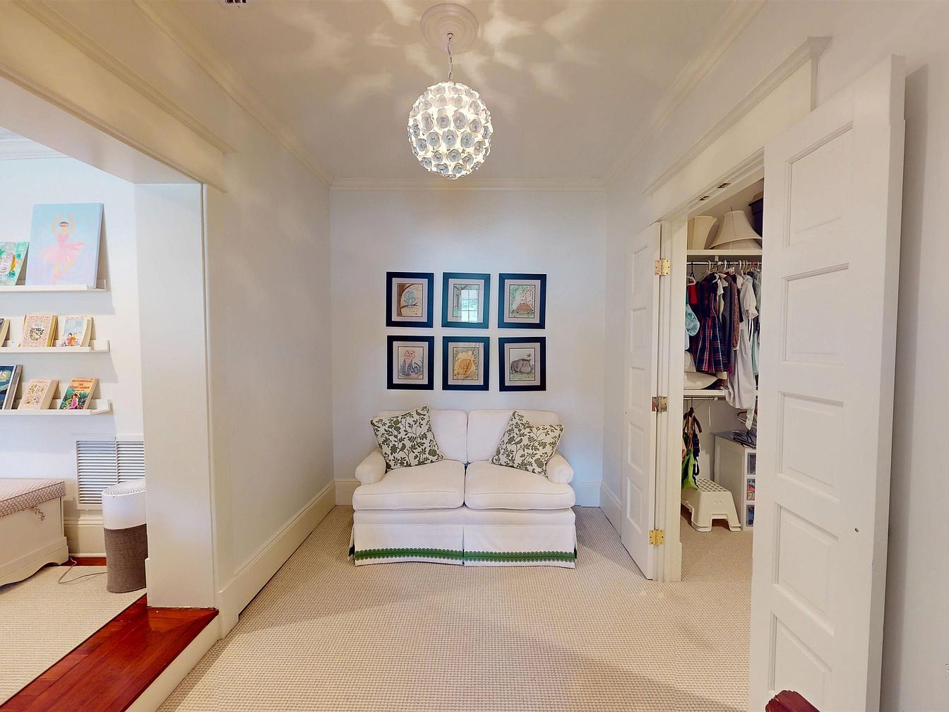 This charming entryway nook features a cozy white loveseat adorned with floral-patterned accent pillows. Four framed artworks hang on the wall behind, adding an artistic touch to the space. The walls are painted in a soft, neutral hue, enhancing the room’s airy feel. A unique pendant light hangs from the ceiling, casting gentle shadows. To one side, a small bookshelf displays neatly arranged books, while the other side reveals a closet accessed by double doors, showcasing a glimpse of household items. Textured carpet complements the warm wooden floor, creating an inviting atmosphere.