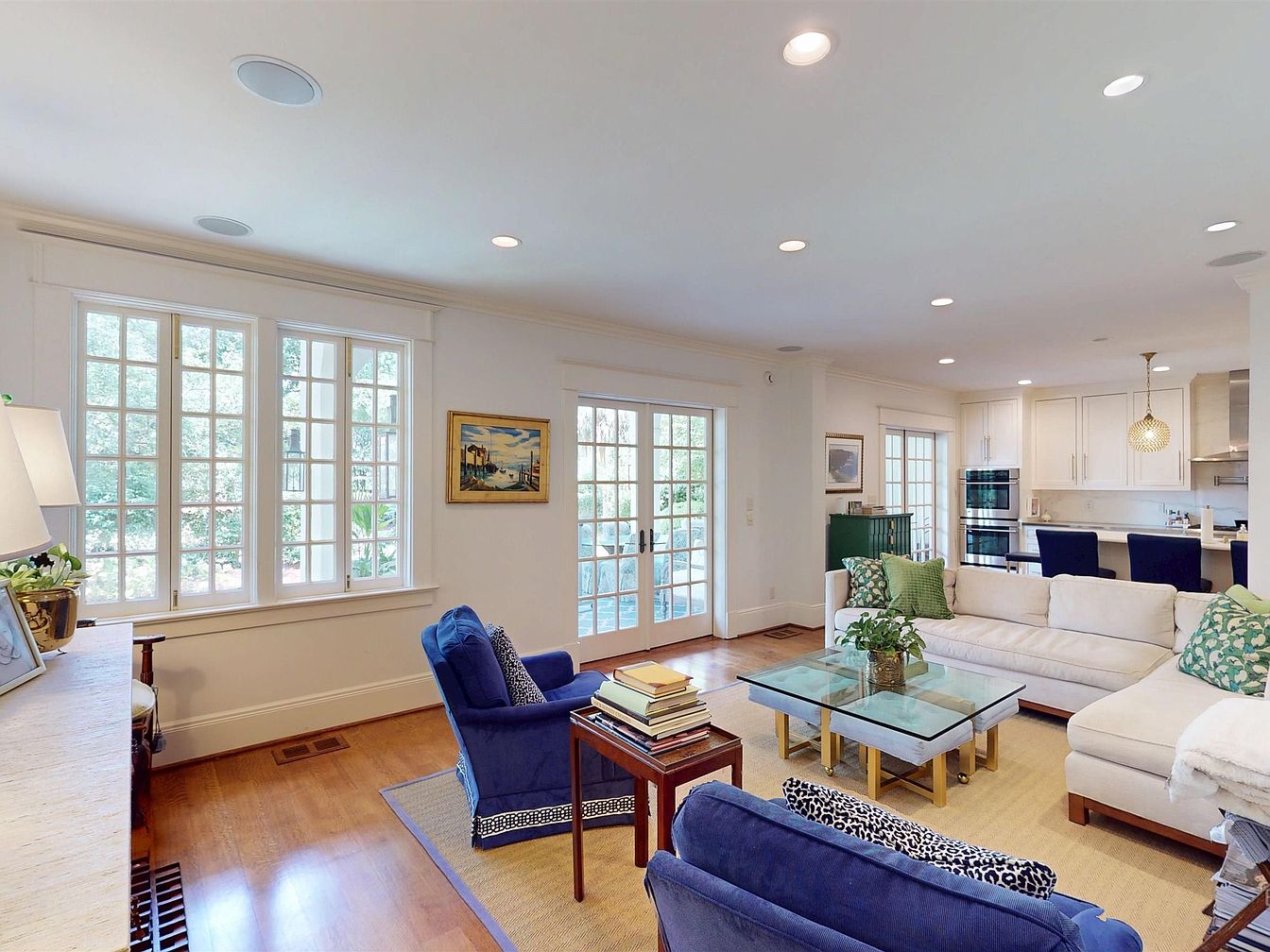 A spacious living room featuring a blend of traditional and modern design elements. The room is adorned with two large windows, allowing natural light to flood in, illuminating the neutral-toned walls. A cozy sectional sofa in light fabric is complemented by vibrant blue chairs and decorative green pillows. A chic coffee table sits atop a textured area rug, surrounded by a few stacked books. The room showcases wooden flooring, providing warmth, and a large potted plant adds a touch of freshness. The kitchen area is subtly visible, featuring sleek cabinetry and contemporary appliances, enhancing the open, inviting atmosphere.