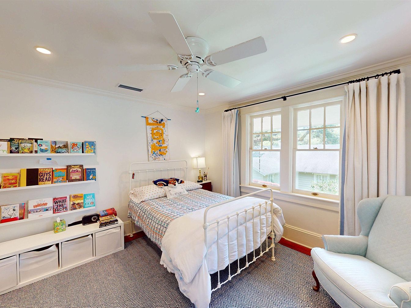 This cozy bedroom features a vintage white iron bed with a colorful patchwork quilt atop. A soft blue accent chair adds comfort next to a sleek nightstand. The walls are painted in a light hue, enhancing the space’s brightness, while natural light floods in through large windows adorned with soft white curtains. A minimalist bookshelf displays an array of children’s books, fostering a love for reading. Underfoot is a textured rug with a herringbone pattern, grounding the room’s aesthetic. A ceiling fan circulates air, balancing comfort and style in this inviting, playful environment.