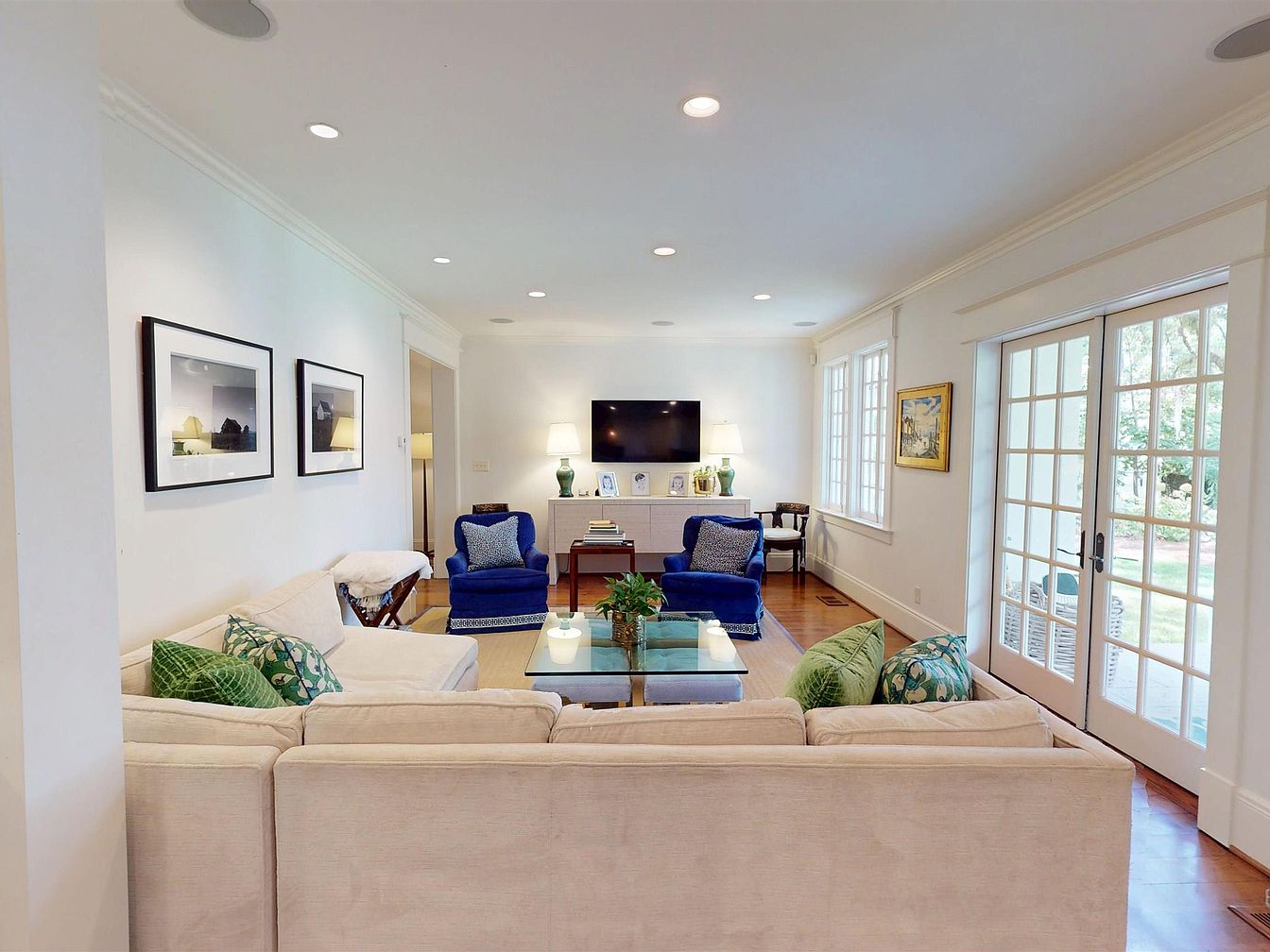 This living room features a cozy, inviting layout. A large sectional sofa in a soft cream hue anchors the space, complemented by vibrant green and blue decorative cushions. Across from the sofa, a solid blue armchair adds a pop of color, while a sleek glass coffee table reflects natural light. Walls are adorned with black-framed photographs, and a console beneath the wall-mounted TV displays tasteful decor. Natural light pours in through double French doors, illuminating wooden flooring. A potted plant brings a touch of nature indoors, harmonizing with the room’s fresh, airy aesthetic that balances modern comfort with classic charm.