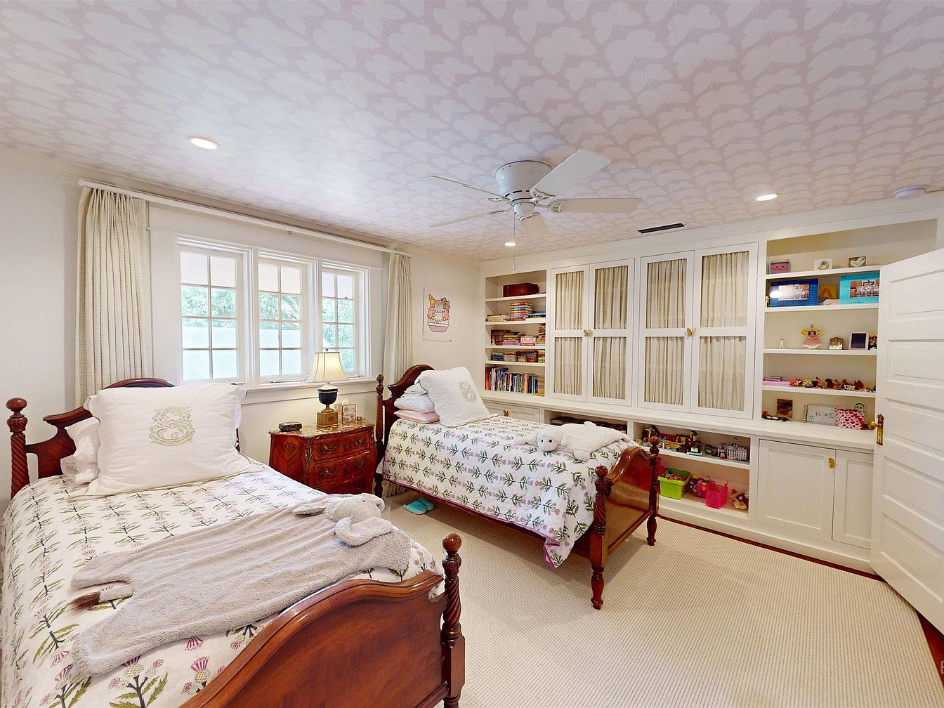 This cozy bedroom features two twin beds with wooden frames, each adorned with floral-patterned bedding. The room is brightened by natural light streaming through large windows, framed by soft, cream-colored curtains. A charming nightstand with a lamp is positioned beside one bed, adding warmth. A wall of built-in cabinetry, with glass-front doors and shelves, showcases books and playful decor. The ceiling boasts a subtle floral pattern that complements the serene color scheme of soft pastels and whites. A plush beige carpet enhances the room’s comfort, creating an inviting atmosphere for relaxation and play.