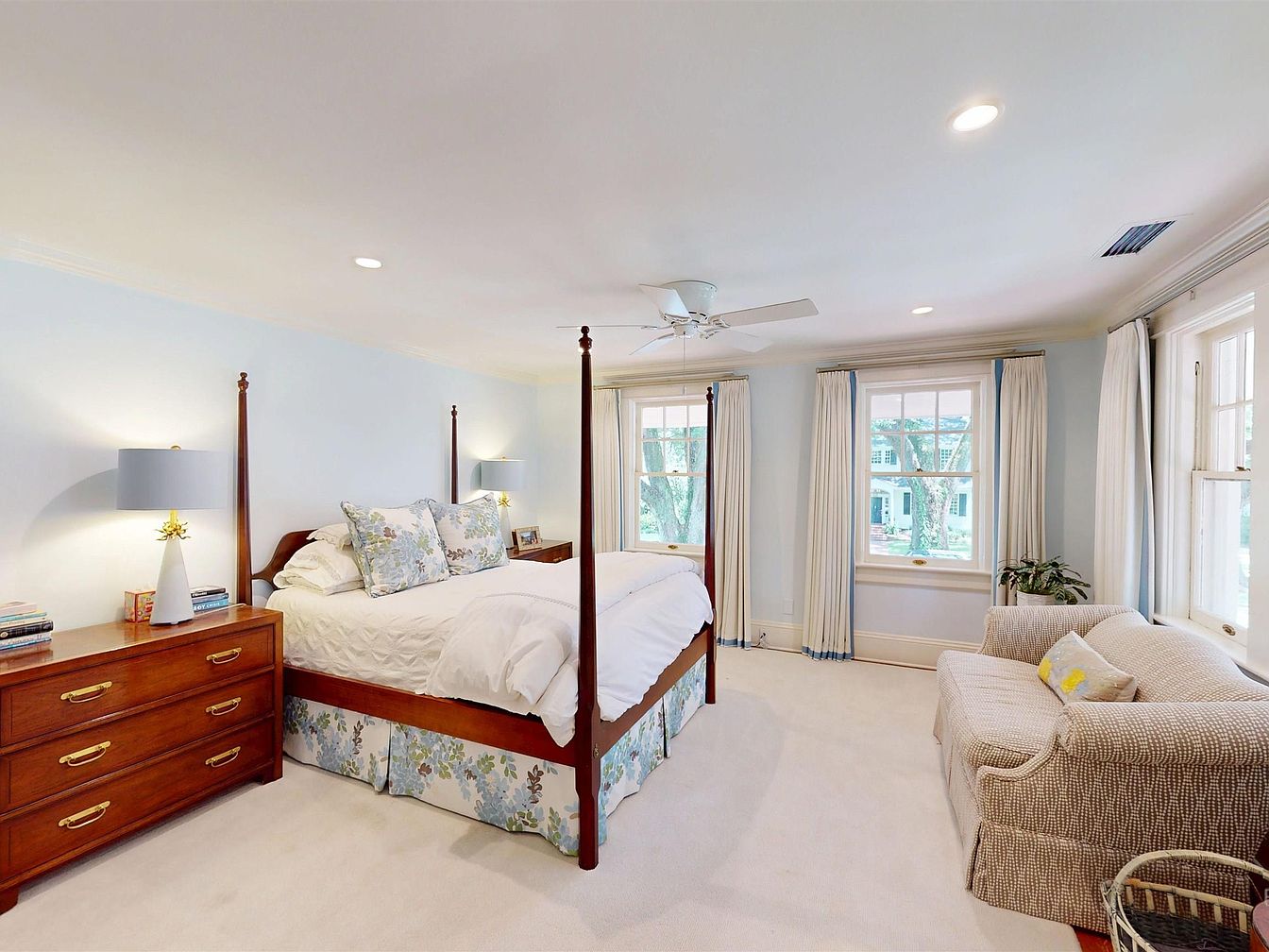 A serene bedroom features a traditional four-poster bed adorned with crisp white linens and floral accent pillows, creating a tranquil atmosphere. To the left, a warm wooden dresser complements the rich textures of the furniture, and two modern lamps illuminate the space. Soft blue walls enhance the room’s coziness, harmonizing with light, sheer drapes framing the windows. Natural light floods through the large windows, providing a view of lush greenery outside. A comfortable beige upholstered sofa invites relaxation, while a decorative throw pillow adds a splash of color, seamlessly blending elegance and comfort.