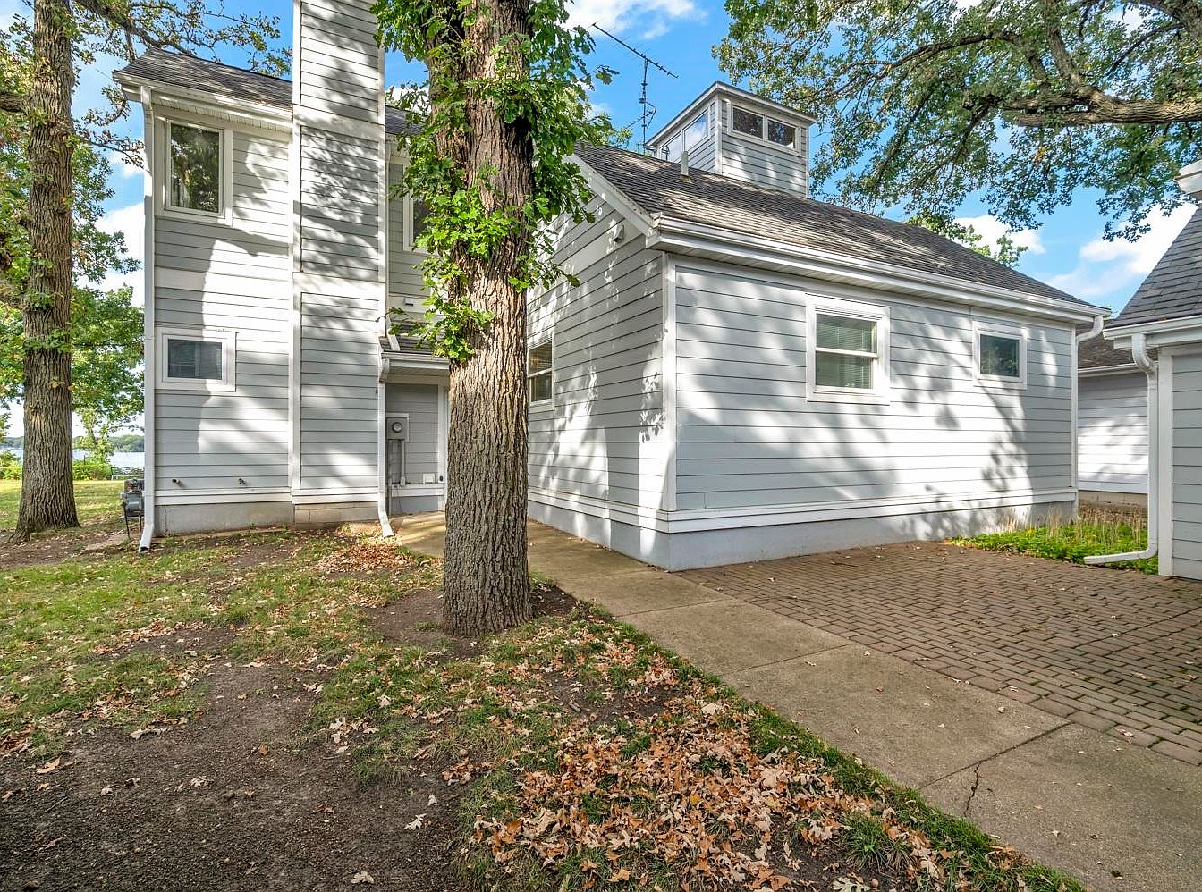 A light grey traditional American home is viewed from its side yard, showcasing classic horizontal siding, crisp white trim, and multiple windows. A paved walkway runs alongside the building, transitioning into a brick patio area. Mature trees with textured bark stand close to the house, their leafy branches providing filtered shadows on the ground and siding. Fallen leaves and patchy grass add to the autumnal feel. Structural features include a protruding chimney, a small entryway tucked beneath an overhang, and an upper cupola with windows, adding a touch of historic character to the otherwise simple, clean lines of the architecture.