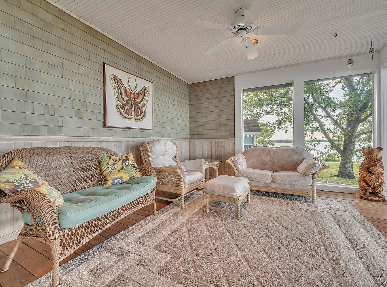 A spacious sunroom filled with natural light from large windows overlooking a leafy yard and water beyond. The room features wicker furniture—including a sofa, armchair, and loveseat—with pastel green and floral cushions, adding a touch of vintage cottage charm. Walls are covered in light sage shiplap and pale wood wainscoting, topped by a crisp white beadboard ceiling with a ceiling fan. A plush, geometric beige carpet softens the wooden floor. Decorative details include a framed butterfly artwork and a whimsical carved bear near the window, creating a relaxed, nature-inspired ambiance perfect for lounging.