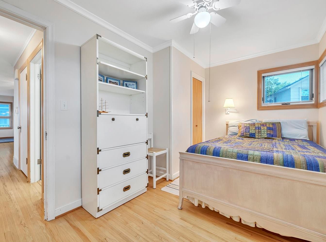 A cozy bedroom corner with light wood flooring and soft beige walls. A queen-sized bed with a pale wood frame sits against the right wall, dressed in a patchwork quilt with blue, green, and yellow hues. Above the bed, one medium-sized window brings in daylight while a simple white ceiling fan offers overhead illumination. In the corner near the bed, a wall sconce provides focused reading light. A sturdy white cabinet with drawers and open shelves stands near the door, holding small framed photos and a decorative model ship. The room feels bright, functional, and neatly organized.