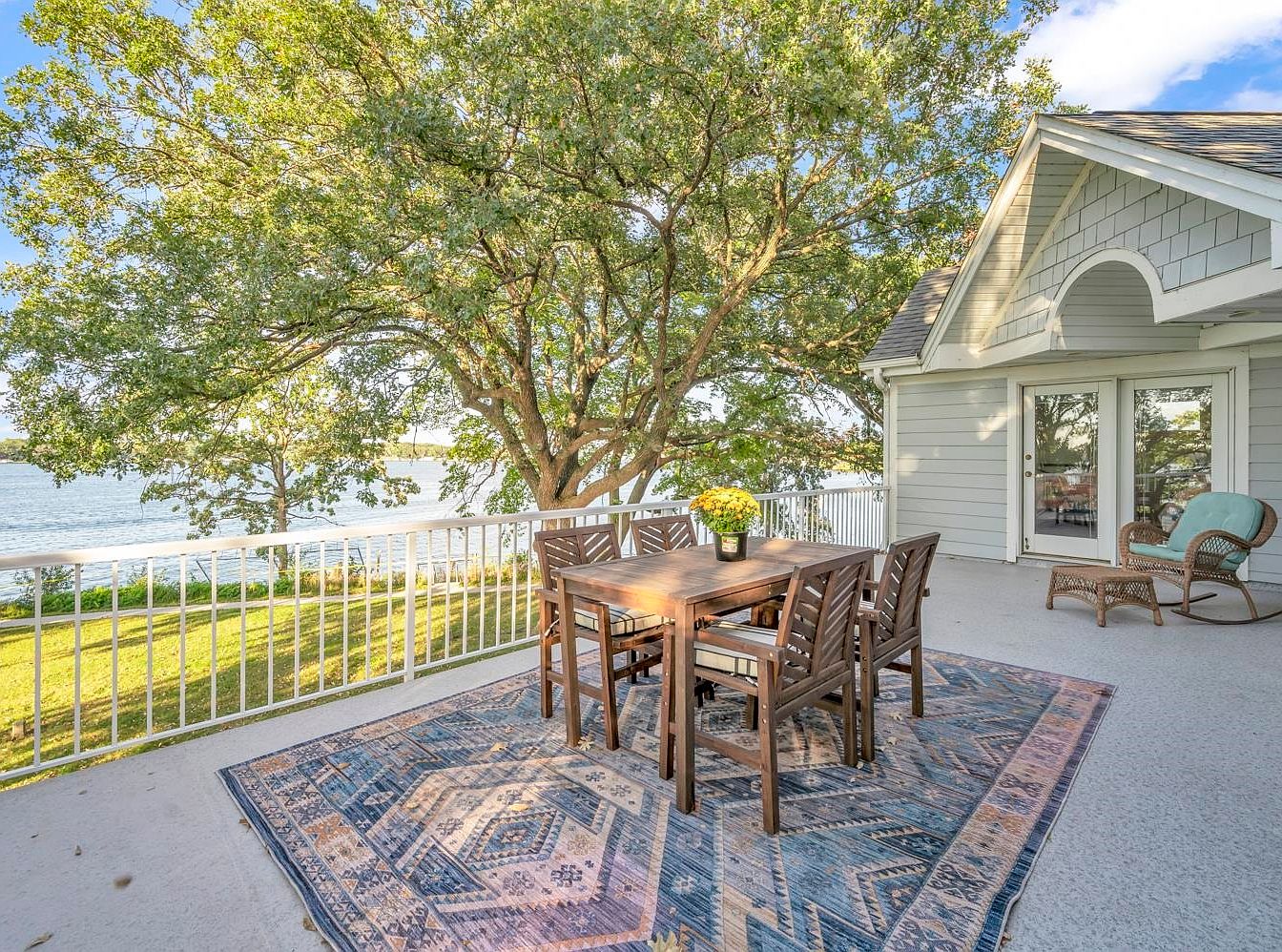 A spacious outdoor patio features a square wooden dining table surrounded by four matching chairs with white cushions, all placed atop a blue and beige patterned rug. The area is bordered by a white metal railing, providing safety while allowing an unobstructed view of the lush green lawn and large leafy trees beyond. In the background, calm lake waters shimmer under a bright blue sky dotted with fluffy clouds. A potted plant with vibrant yellow flowers adds a cheerful touch to the table, creating a serene and inviting spot ideal for alfresco meals or relaxing with nature.