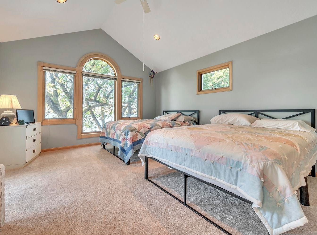 Vaulted ceiling bedroom featuring two queen-sized beds with simple metal frames and pastel patchwork quilts. Walls are painted a soft gray, complemented by plush beige carpeting. A striking set of large windows dominates the far wall, including a central arched window flanked by two rectangular panels, all framed in natural wood, offering tree-filled views and abundant natural light. A small rectangular window above one bed adds further brightness. To the left, a white three-drawer dresser holds a table lamp, decorative accents, and a small screen. The overall feel is tranquil, airy, and inviting, blending comfort with natural aesthetics.