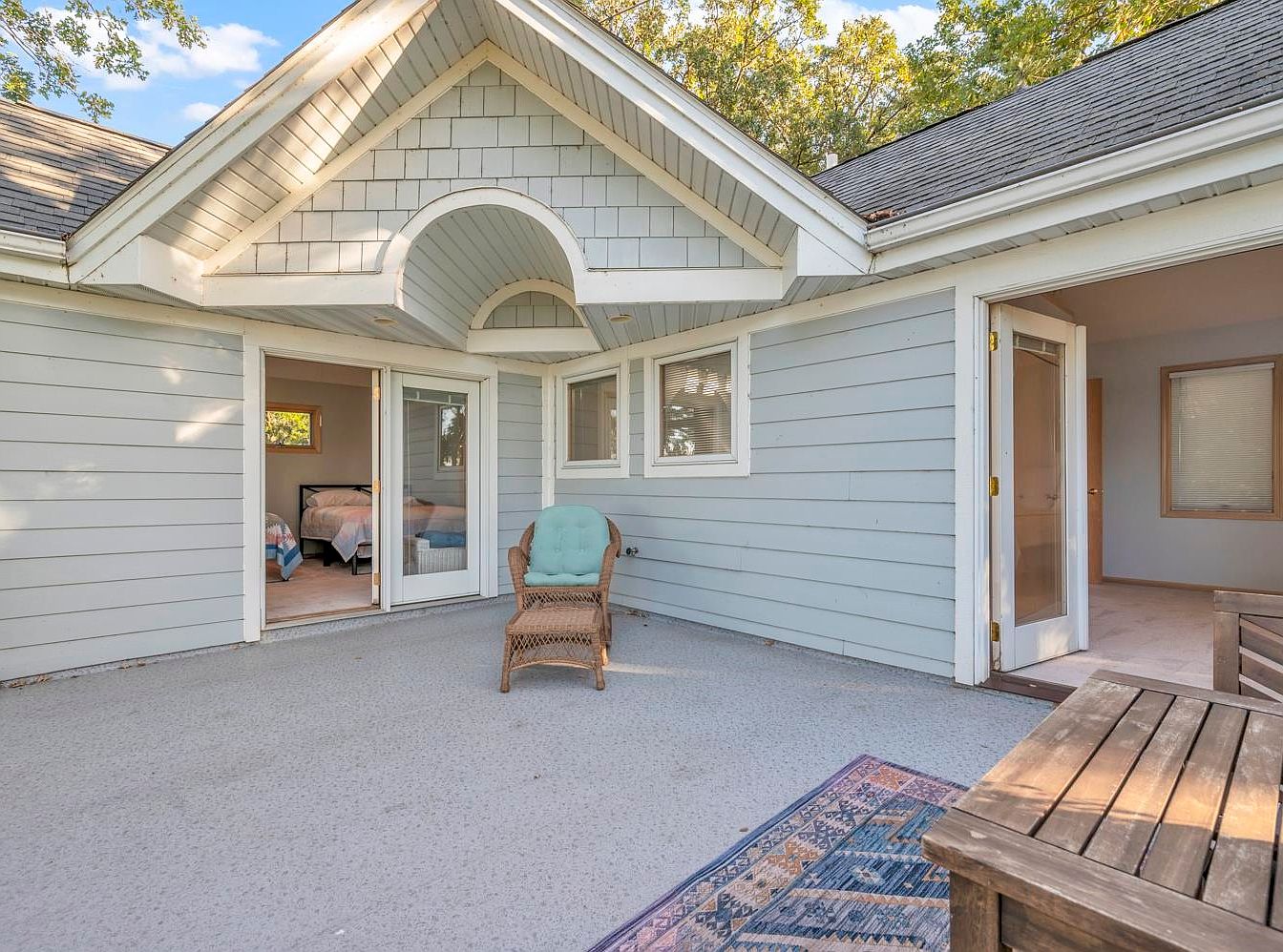 A spacious patio area is bordered by light blue horizontal clapboard siding and architectural white trim. Two large sliding glass doors provide entry to adjacent bedrooms, while a traditional hinged door opens into another section of the home. A wicker armchair with a turquoise cushion is placed centrally, inviting relaxation. A patterned outdoor rug and part of a wooden patio table add warmth and texture to the muted, airy palette. The gabled overhang above the sliding doors features decorative trim and creates an inviting focal point for this serene, semi-private outdoor space. Mature trees provide a tranquil backdrop.