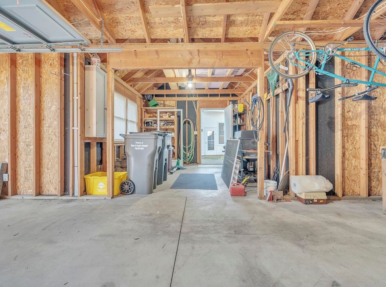 An unfinished garage space featuring exposed wooden framing, uninsulated walls, and a pitched ceiling with visible rafters and particle board sheathing. The concrete floor is clean and extends to the back, where there is a door leading outside. Two large trash bins and a yellow recycling bin are lined up along the left wall under a window that allows natural light to brighten the space. The right wall is equipped with storage hooks, hoses, and a blue bicycle hanging overhead. Shelving with tools and garden supplies lends a practical, functional atmosphere to the work-focused area.