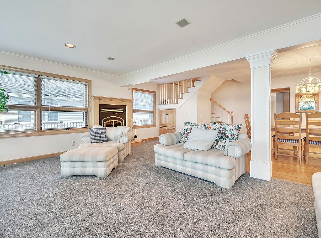 A spacious living room with a soft, neutral color palette featuring light gray carpet and cream walls with wood trim. Two large, plush armchairs with light pastel plaid upholstery and floral accent pillows are arranged around a traditional wood-trimmed fireplace, which is positioned below two expansive windows that allow ample natural light. Architectural columns separate the living area from the adjoining dining space, visible through an open doorway. A wooden staircase with white spindles and oak railings leads upward near the dining table, creating a seamless flow between spaces. The overall aesthetic is cozy, bright, and welcoming, with traditional-meets-casual charm.