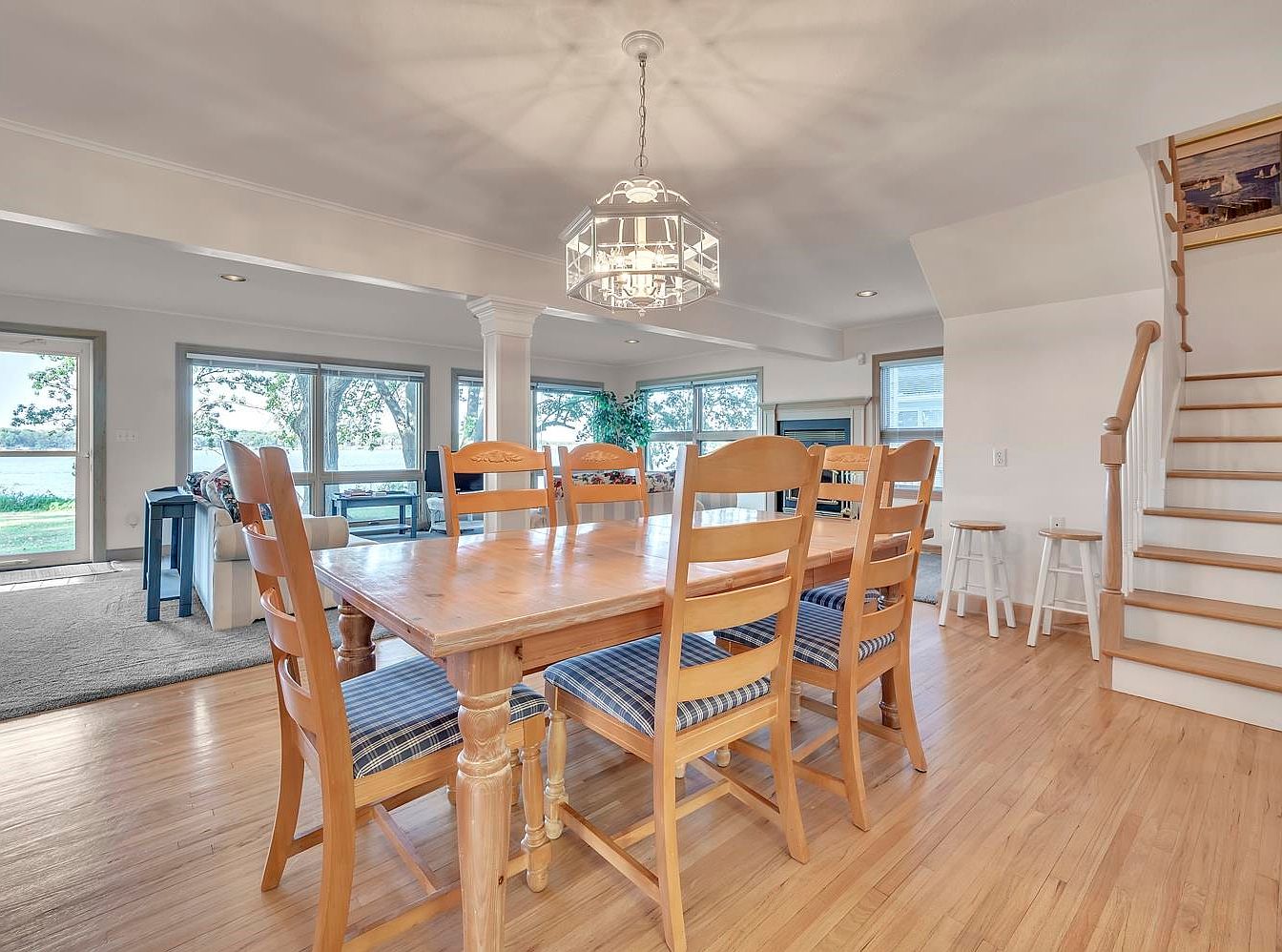 A spacious dining area features a sturdy wooden table with six matching chairs, each with blue plaid fabric cushions. The floor is a warm, light-toned hardwood that coordinates with the furniture. A geometric, glass-paneled chandelier hangs above the table, providing elegant overhead lighting. The room flows openly into the living space, which is divided by a classic white column. Large windows on one side provide abundant natural light and scenic outdoor views, creating an airy, relaxed atmosphere. To the right, a simple staircase with white risers leads to the next floor, next to two white bar stools against the wall.
