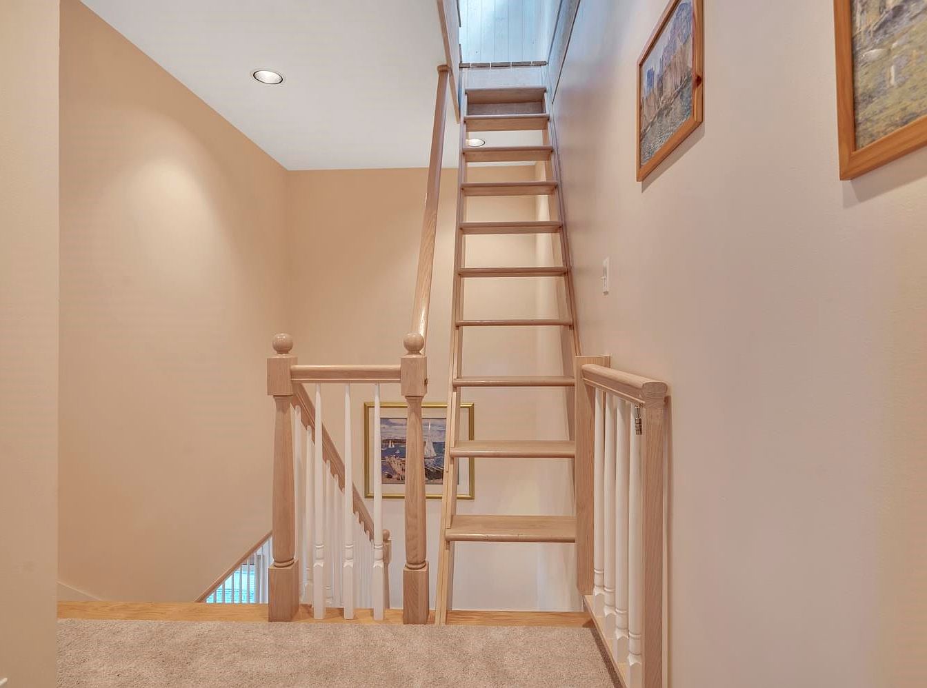 A light wood staircase with open risers ascends to what appears to be an attic or upper loft, accessed through a square opening in the ceiling. The surrounding space features beige walls and matching beige carpeting, creating a soft and welcoming atmosphere. White spindles and natural wood banisters define the landing, while recessed lighting in the ceiling enhances the brightness. Framed artwork in wooden frames adds visual interest to the walls. The overall aesthetic is warm, clean, and understated, with a blend of classic detailing and practical design elements for transitional spaces.