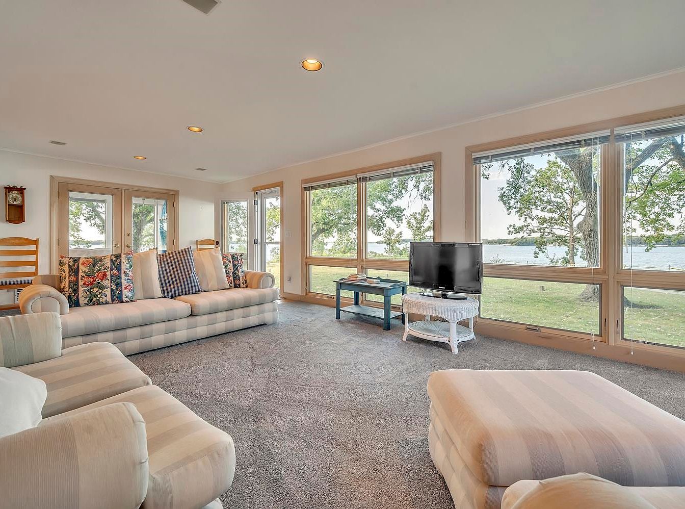 Spacious living room with floor-to-ceiling windows along one wall providing an expansive view of a lush green lawn and a large lake beyond. The room features a soft, neutral palette with cream and beige striped seating, including a large sofa and armchair. Bold patterned throw pillows add pops of color. Plush gray carpet covers the floor, and recessed lighting creates a warm ambiance. French doors and matching windows bring in abundant natural light, while a small blue coffee table and a white wicker TV stand contribute to the relaxed, cottage-like atmosphere. Wooden accents on furniture and trim add to the inviting feel.