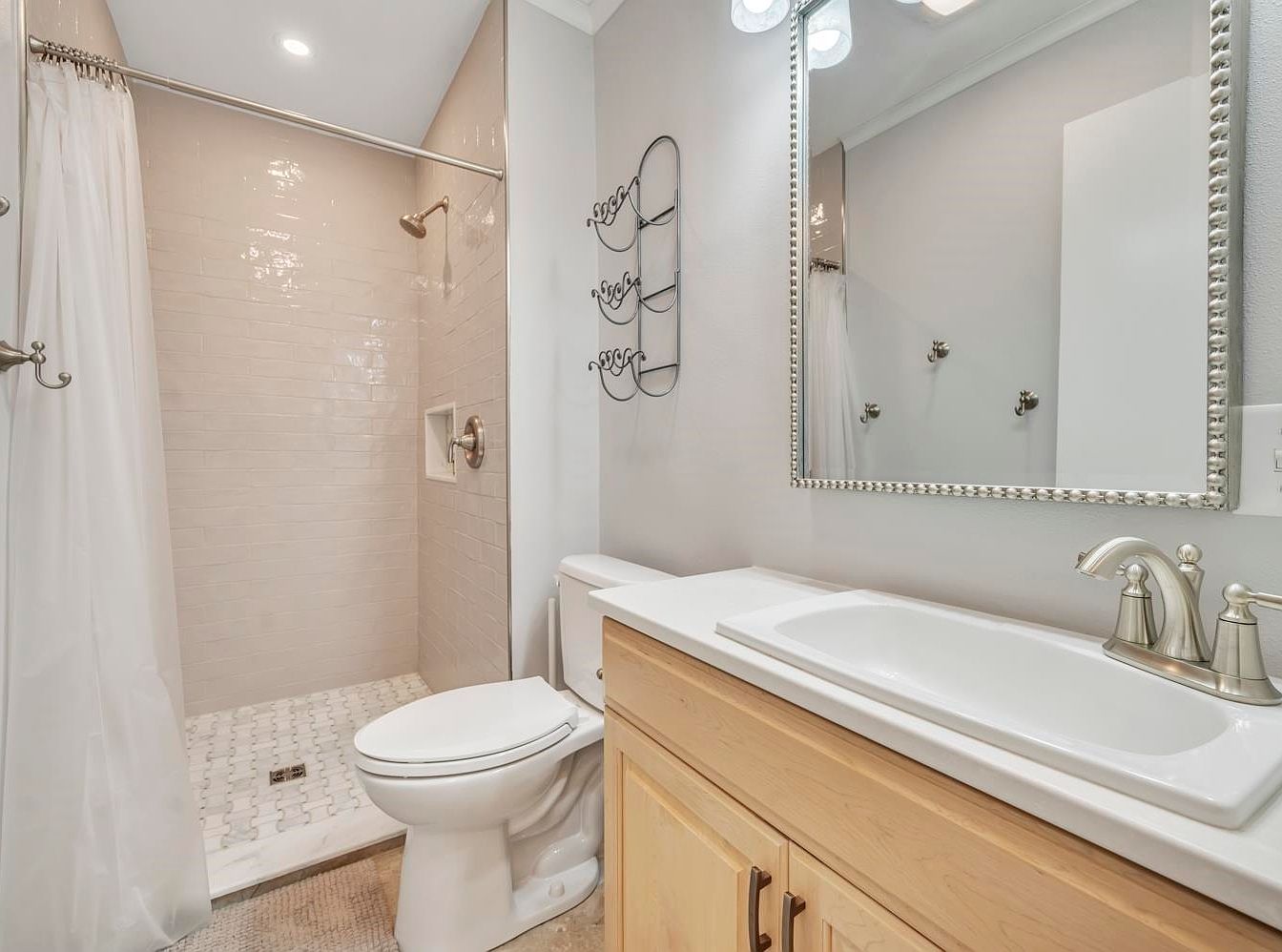 A bright, contemporary bathroom with a walk-in shower featuring glossy beige subway tiles and a small built-in shelf. The floor of the shower is finished in light hexagonal tiles, while a white curtain hangs from a sleek chrome rod. The vanity has light wood cabinetry and a wide white countertop with an elongated sink and brushed nickel faucet. A large rectangular mirror with a metallic beaded frame sits above the sink, reflecting the soft overhead lighting. The overall color scheme is neutral, with soft beige and white tones complemented by metallic fixtures for a clean and welcoming look.