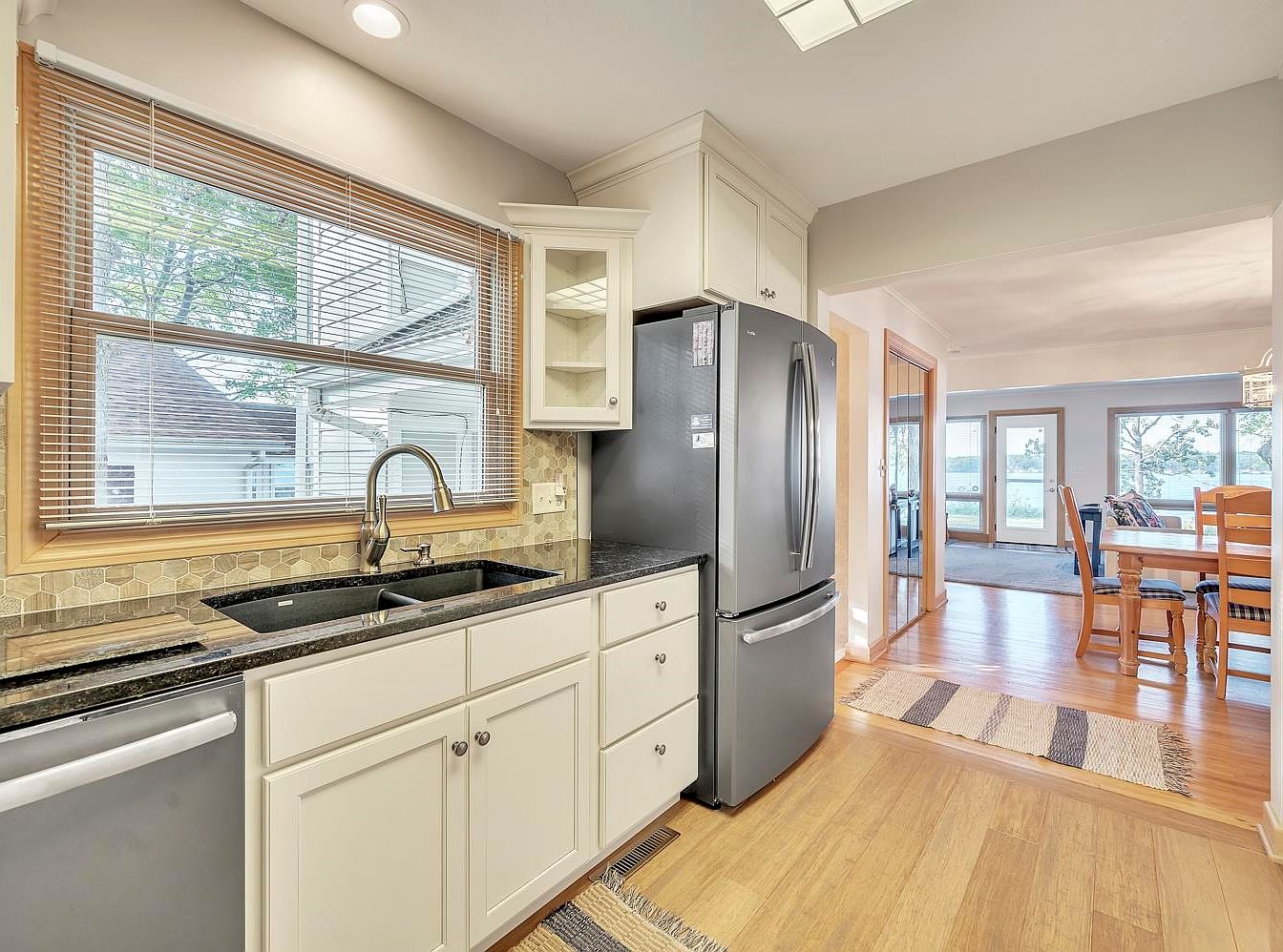 The room features a modern kitchen with creamy white cabinetry, sleek black granite countertops, and stainless steel appliances including a large refrigerator and dishwasher. The sink area sits beneath a wide window framed with light wood trim and fitted with horizontal blinds, bringing in abundant natural light. A hexagonal tile backsplash adds subtle texture behind the counters. Warm wood floors run continuously into the adjacent dining space where a wooden table with matching chairs is visible. The open layout leads into a sun-filled living area with large windows and a glass door offering scenic outdoor views, creating an inviting and cohesive flow.