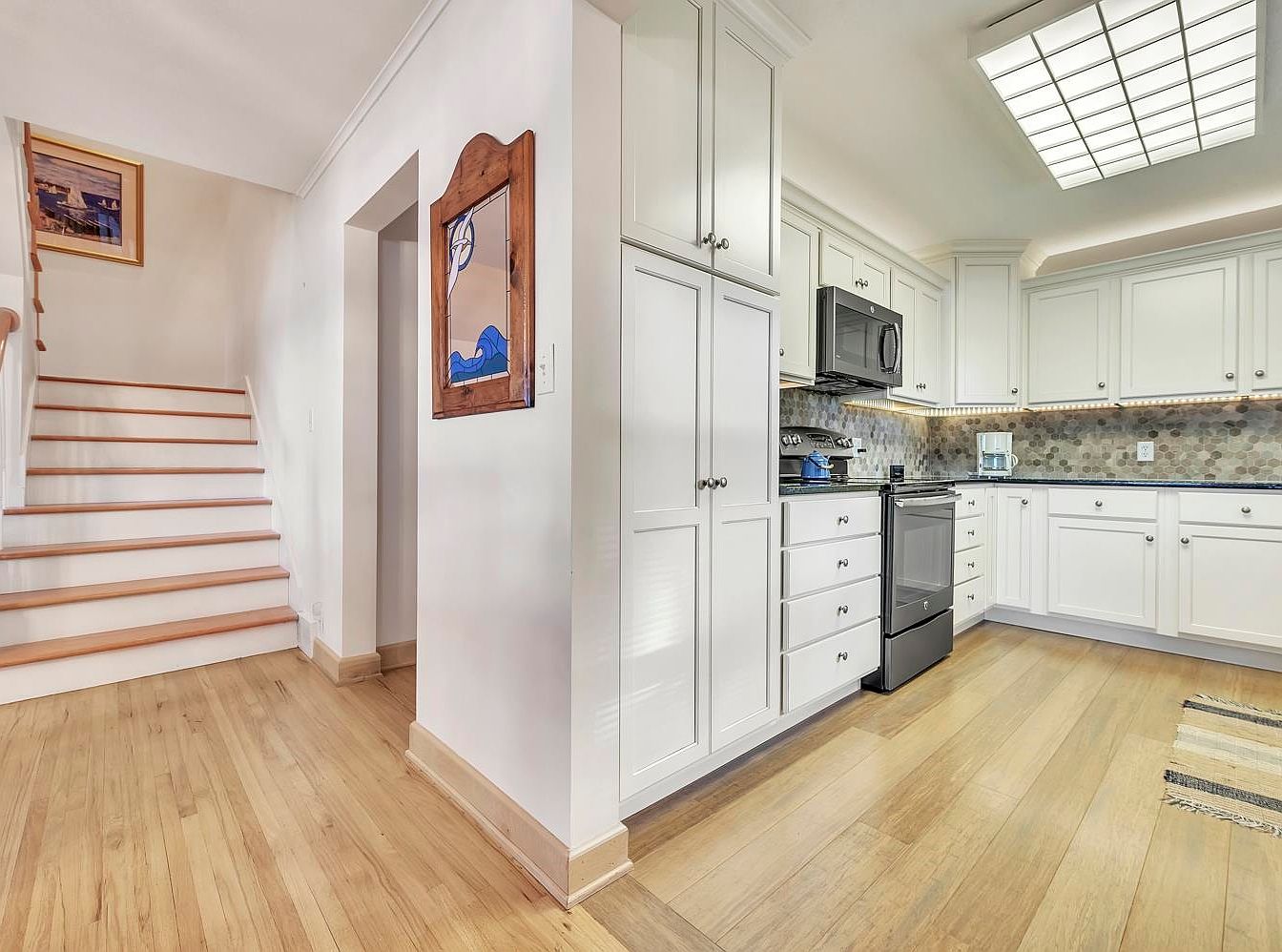 Warm wood floors flow seamlessly from the hallway into the kitchen, where crisp white cabinetry lines the walls, providing abundant storage and a fresh, bright atmosphere. The kitchen features a modern stainless steel oven and black microwave, with a hexagonal tile backsplash in muted earth tones that adds subtle visual interest. Soft under-cabinet lighting enhances the workspace, while a geometric grid light fixture on the ceiling illuminates the room. The nearby stairway, also finished in pale wood with white risers, adds to the airy, welcoming vibe, and a piece of framed art and a decorative mirror introduce character and color.