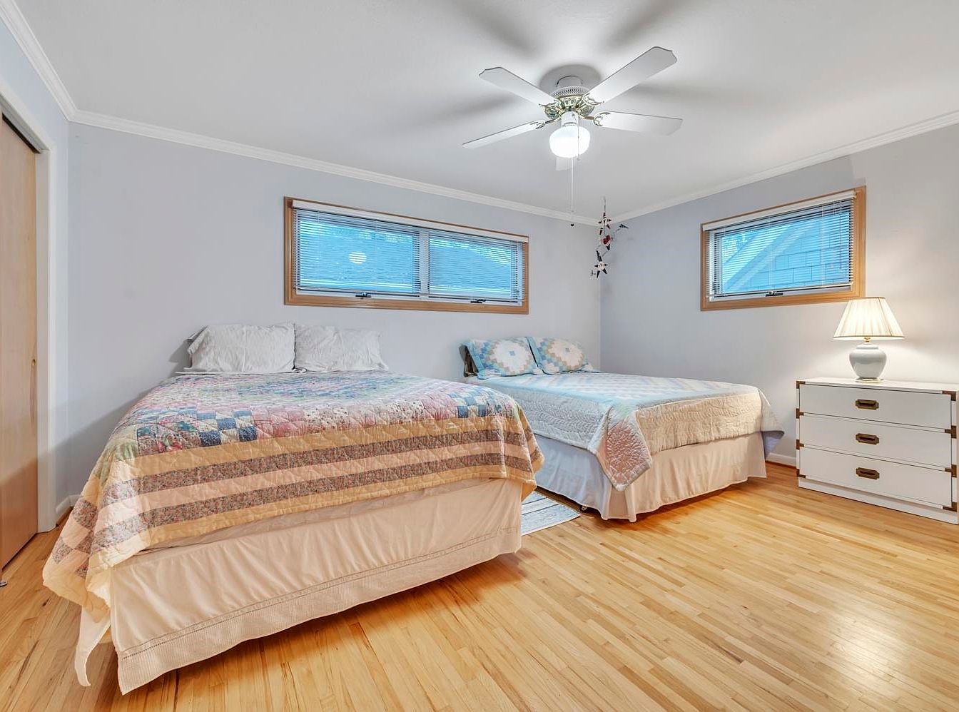 A spacious bedroom features two large beds positioned side by side, each covered with pastel patchwork quilts that add a cozy, vintage feel. The walls are painted a soft light gray, contrasted by white crown molding and baseboards for a clean look. Natural wood trim frames three horizontal windows, allowing gentle light into the room. A white ceiling fan with a light fixture is centrally mounted for comfort. The floors are finished with light-colored wood, and a white dresser with gold-accented handles sits in the corner with a classic ceramic lamp, completing the serene and inviting atmosphere.