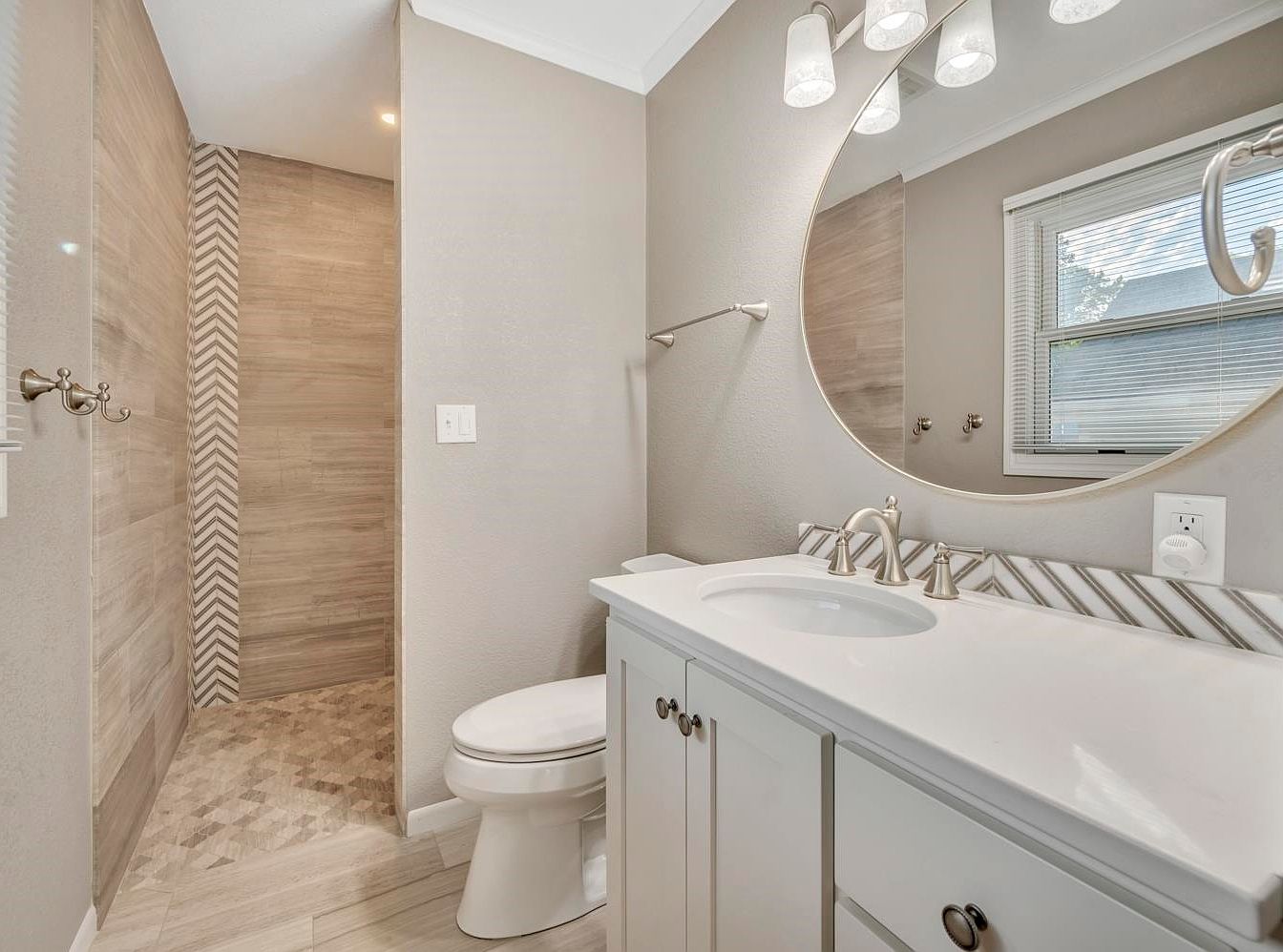 A modern bathroom features a neutral color palette of soft beige and creams, with light wood-textured tiles on the floor and shower walls. The walk-in shower highlights an accent of chevron-patterned tiles for visual interest. The vanity has clean white cabinetry and sleek brushed nickel hardware, complemented by a white countertop with an integrated sink. Above the vanity is a large, round mirror framed in gold, reflecting the room’s minimalist style. Three glass-shaded light fixtures provide filtered illumination, while a window with blinds brings in natural light, creating a bright and airy atmosphere.