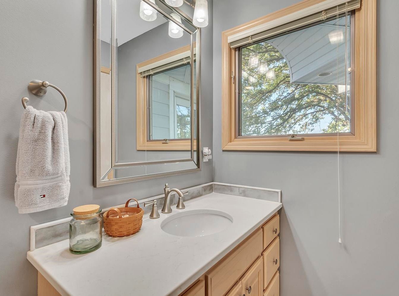 A serene bathroom vanity area featuring light wood cabinetry with silver knobs and a white marble countertop. The oval sink is complemented by brushed nickel faucet and fixtures, including a towel ring holding a white towel. Above the sink is an elegant, large rectangular mirror with a detailed metallic frame, reflecting ambient light from three glass-shaded bulbs overhead. A window with pale wood trim allows abundant natural light and views of leafy trees, adding to the tranquil atmosphere. Accents on the countertop include a small woven basket and a glass jar, contributing to a clean and welcoming aesthetic.