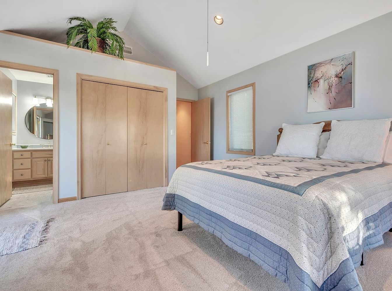 A spacious bedroom with light gray walls and soft beige carpeting. The bed features a simple wooden headboard, white pillows, and a blue and cream patchwork quilt. Above the bed hangs a modern abstract painting in muted tones. The room includes two doors: one leading to a bathroom with light wood cabinetry and a large round mirror, and another to an adjoining space. Dual closet doors in blonde wood match the trim throughout. A leafy green plant sits on a high shelf above the closet, and a single window with blinds lets in natural light, adding to the calm, airy atmosphere.