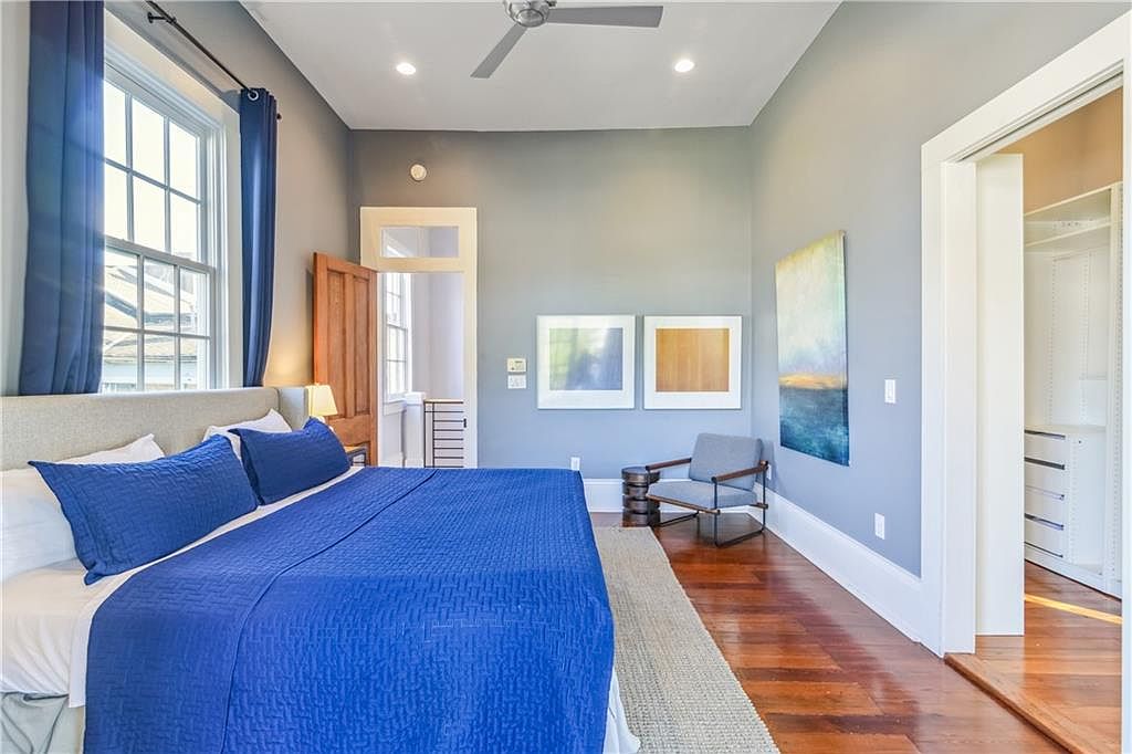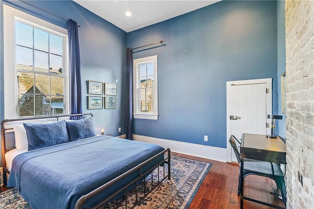 The bedroom features a calming blue color scheme with deep blue walls accentuated by natural light from large windows. A stylish wrought iron bed adorned with layered blue bedding serves as the room’s focal point. Classic hardwood floors add warmth, complemented by a vintage area rug. To one side, a compact desk with a sleek black chair offers a practical workspace, while framed art adds a touch of character to the walls. Architectural details include a small white door likely leading to a closet, enhancing the room’s vintage charm while maintaining a cozy and serene atmosphere.