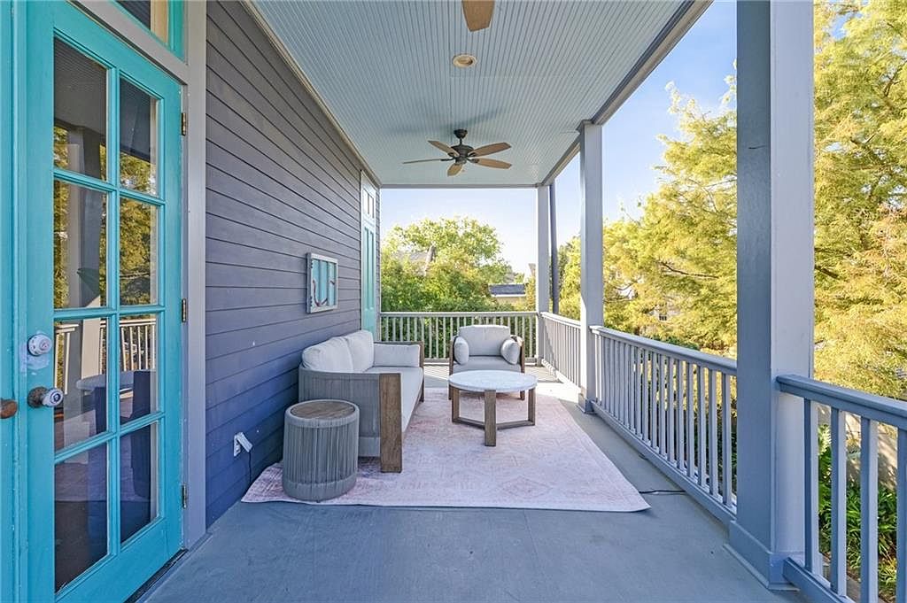 A charming front porch adorned with a soothing color palette of muted blue and crisp white. The walls feature a darker blue siding, complemented by a vibrant turquoise door that invites warmth. Comfortable seating arrangements include a soft white couch and a round wooden coffee table, set atop a light-hued area rug. Overhead, a ceiling fan circulates gentle breezes, while the ample space encourages relaxation or social gatherings. The open railing offers unobstructed views of the lush greenery outside, creating a serene connection with nature. This inviting setup makes for a perfect outdoor retreat.