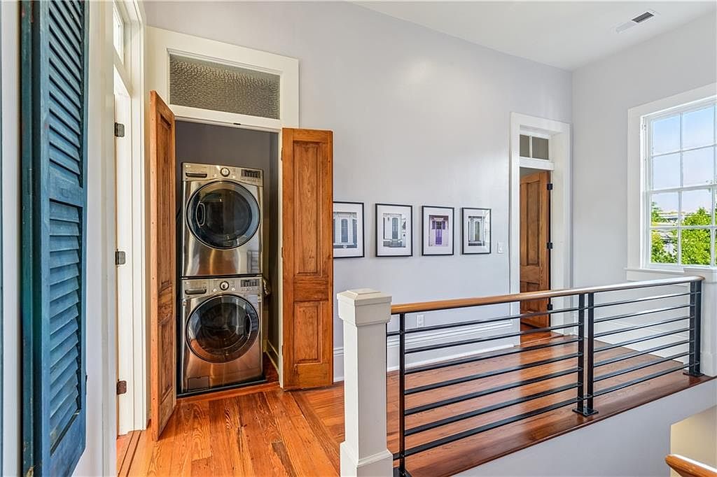 This space features a compact laundry nook situated near a staircase. Two modern, stacked washers and dryers are tucked behind warm wooden doors, enhancing functionality. The walls are painted in a soft gray, providing a neutral backdrop that complements the rich, polished hardwood flooring. Beside the laundry appliances, five framed pictures are displayed on the wall, adding a personal touch. Natural light streams in through a large window, creating a bright atmosphere. A sleek, black metal railing borders the upper level, offering both safety and a contemporary aesthetic, seamlessly merging traditional and modern design elements.