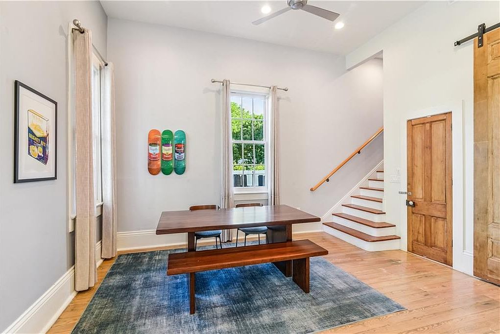 A cozy dining area features a large, rustic wooden table with bench seating, inviting warmth and a communal feel. The walls are painted a soft gray, providing a calm backdrop for the space. To one side, large windows adorned with light beige curtains allow natural light to filter in, illuminating the room. A colorful display of skateboard art on the wall adds a playful touch, contrasting nicely with the understated decor. The hardwood floor is polished and adds warmth, while a textured area rug grounds the table. A staircase with wooden steps leads to the upper level, enhancing the open layout.