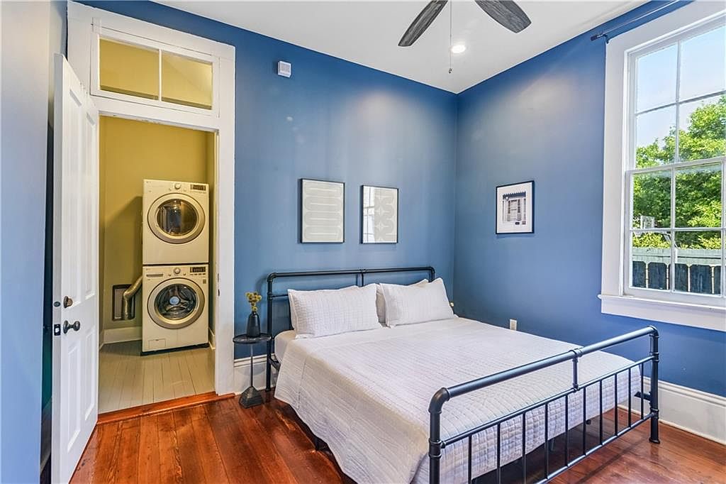 A cozy bedroom features deep blue walls paired with natural light flooding in from large windows. The room is accented by rich wooden floors, enhancing its warmth. A black metal bed frame, draped with crisp white bedding, anchors the space. In one corner, a sleek nightstand holds a small plant, adding a touch of greenery. On the walls, minimalistic artwork complements the color palette without overwhelming the space. Adjacent to the bedroom, a compact laundry area is discreetly integrated with modern machines visible through an open door, emphasizing both functionality and style in a historically rich setting.