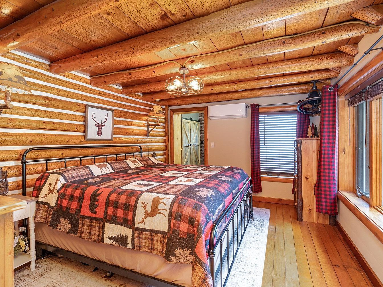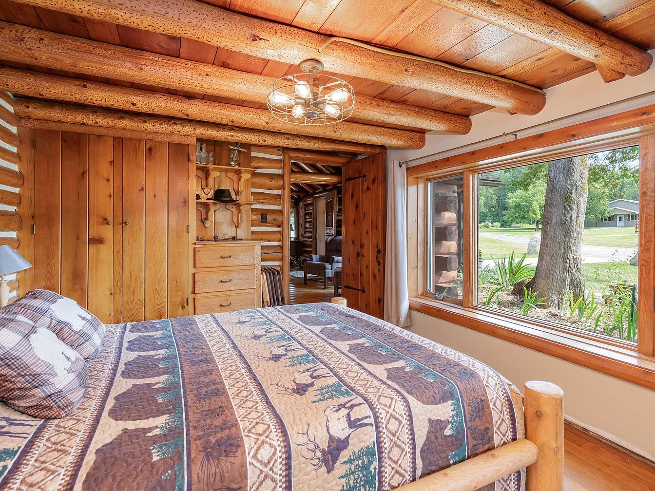 A cozy log cabin bedroom features natural wood walls, ceiling beams, and floors in warm honey tones, emphasizing a rustic aesthetic. The bed, with a wooden frame and wildlife-themed quilt in earth tones, sits near a large window that fills the space with daylight and offers a view of the front yard, trees, and a distant neighboring house. Built-in wooden cabinetry and shelving add storage and display space, while the log construction brings organic texture and a sense of historic charm. The light fixture above the bed has a vintage-industrial feel, complementing the room’s inviting, nature-inspired atmosphere.