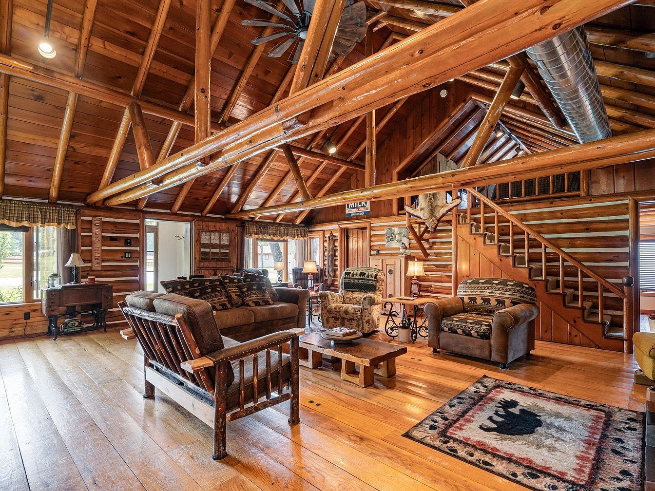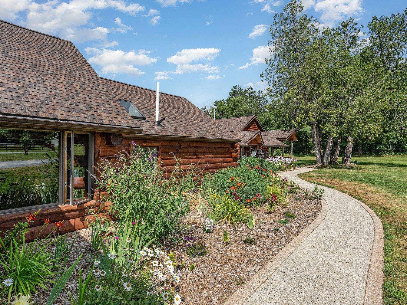 A sprawling log cabin-style home sits nestled amidst mature trees and manicured lawns. The facade features rustic red-toned wooden logs and a shingle roof with gabled sections, offering a classic lodge feel. Large boulders and well-kept flower beds line the curved paved driveway, enhancing the natural setting. The layout shows multiple connected sections, including a covered breezeway that leads to an additional wing, providing architectural interest and functionality. Tall trees frame the home, adding privacy, while open skies and expansive green lawns create a tranquil atmosphere around the property.
