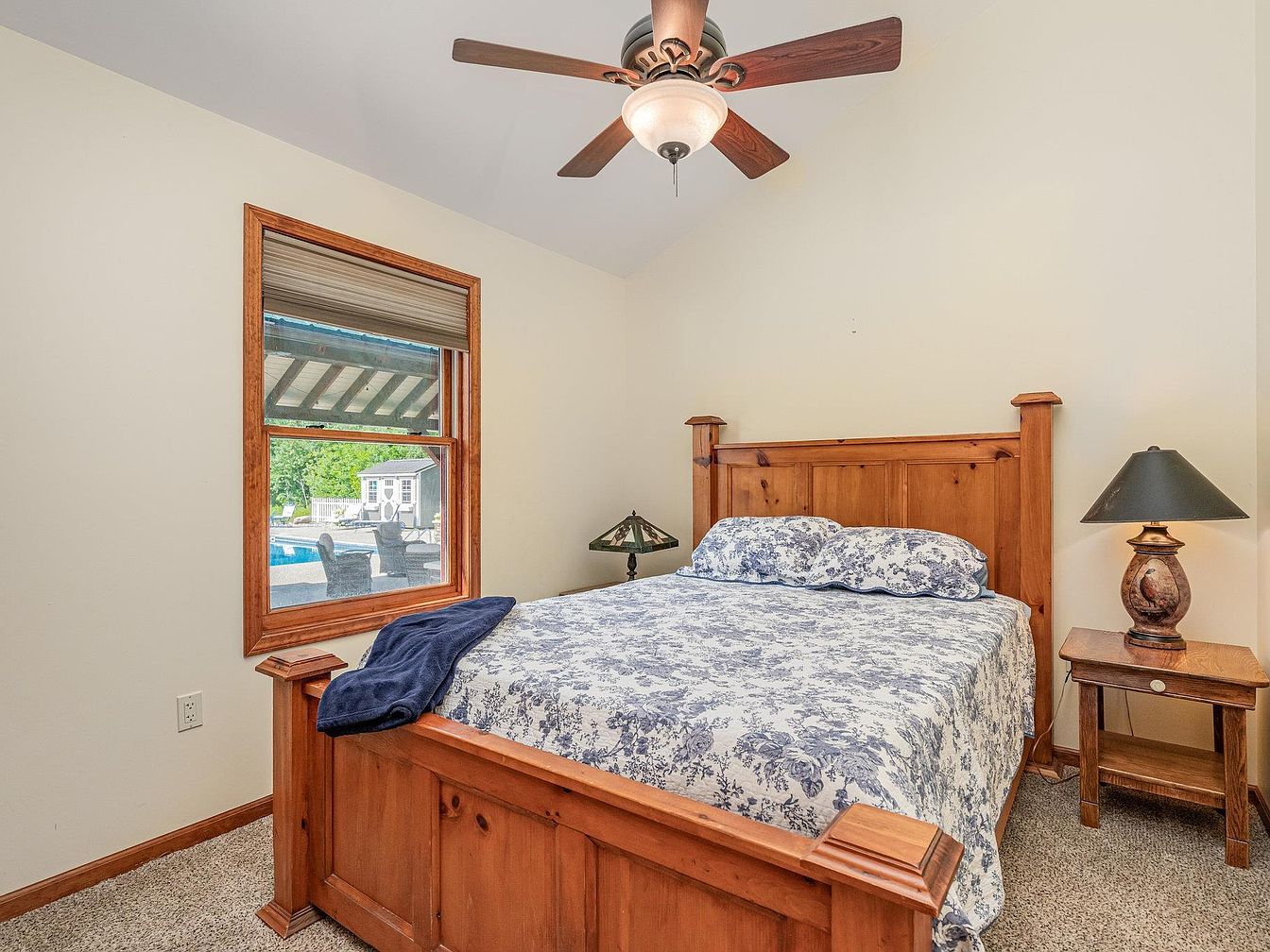 A cozy bedroom featuring a wooden bed frame with a matching nightstand to the right. The bed is dressed in blue and white floral bedding, with an extra navy blanket folded at the foot. There is a window on the left side with natural light streaming in, revealing a view of patio furniture and a pool outside. The walls are painted a soft off-white, and the room is accented by natural wood trim and beige carpet. A ceiling fan with wooden blades and a central light fixture hangs overhead, while a traditional table lamp sits on the nightstand.