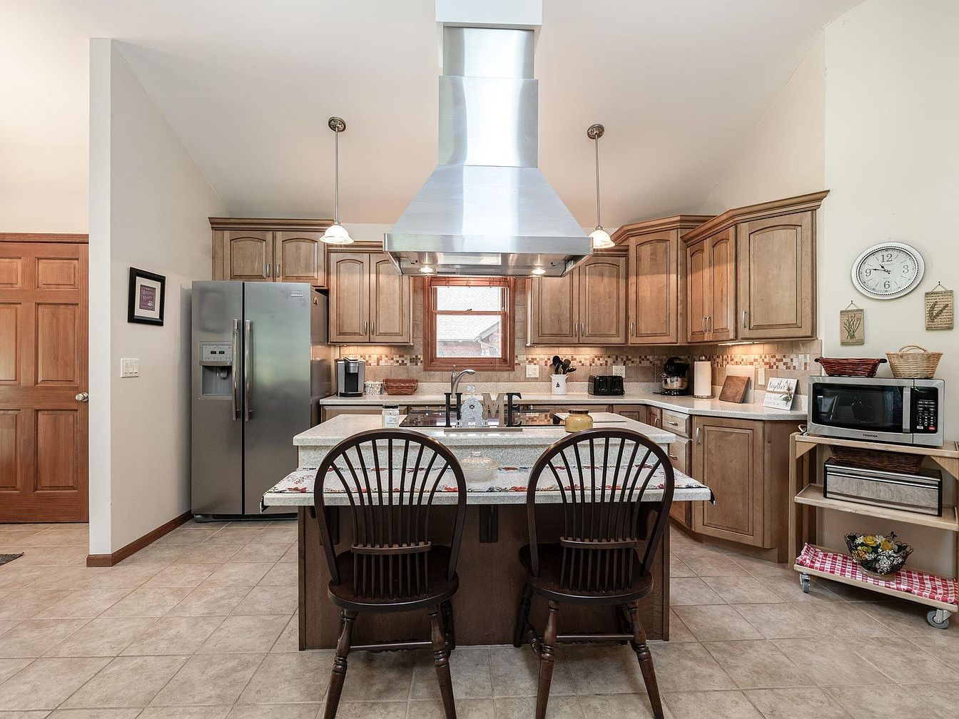 Warm, inviting kitchen with a central island featuring two dark wooden chairs pushed up to an L-shaped speckled countertop. Natural wood cabinets with brushed metal handles line the walls, offering ample storage and a classic look. Above the island, a large stainless steel range hood and two pendant lights create a focal point. The backsplash is a blend of neutral tiles, complementing the beige-tan floor tiles. Appliances, including a modern stainless refrigerator, coffee maker, microwave, and toaster oven, sit conveniently along the counters. A round wall clock and baskets add a homely touch, while soft lighting and wood trim finish the cozy, functional space.