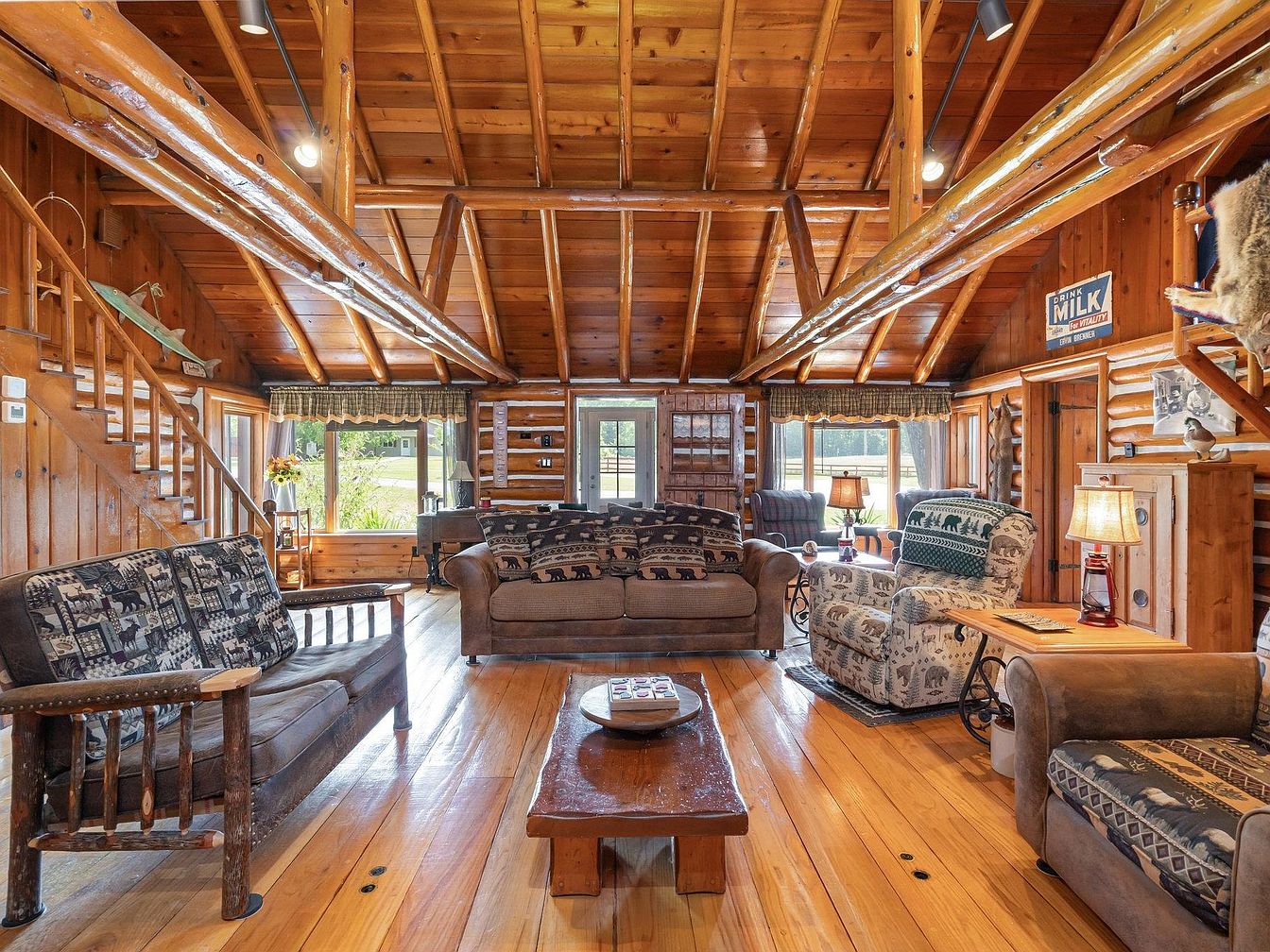 A spacious, open-concept living room with rustic log cabin aesthetics. The room features honey-colored wood panels covering the floors, walls, and exposed vaulted ceiling beams. Natural light filters in from large windows with green plaid valances. Comfortable, overstuffed sofas and armchairs are arranged around a low wooden coffee table, each upholstered in cushions with woodland animal and geometric patterns. Accents include cozy table lamps, vintage decor, and Americana signs, lending warmth and charm. On the left, a wooden staircase rises to a loft, adding architectural interest. The overall feel is inviting, earthy, and reminiscent of traditional American lodges.