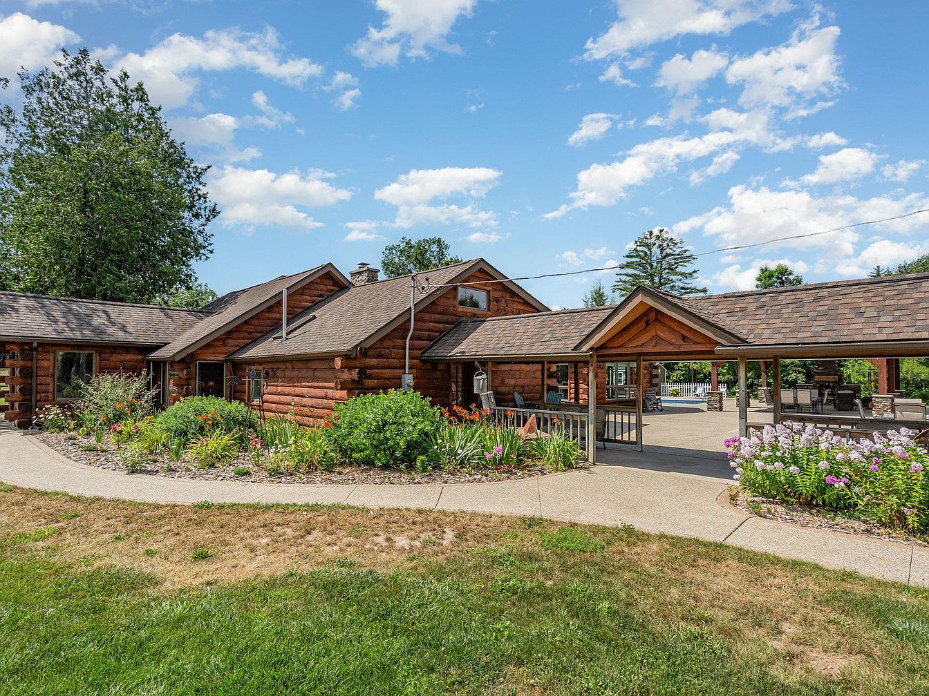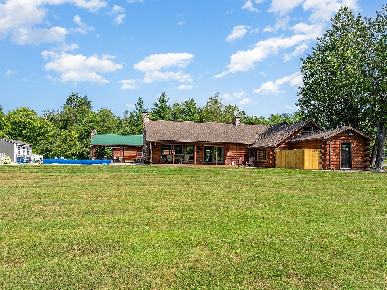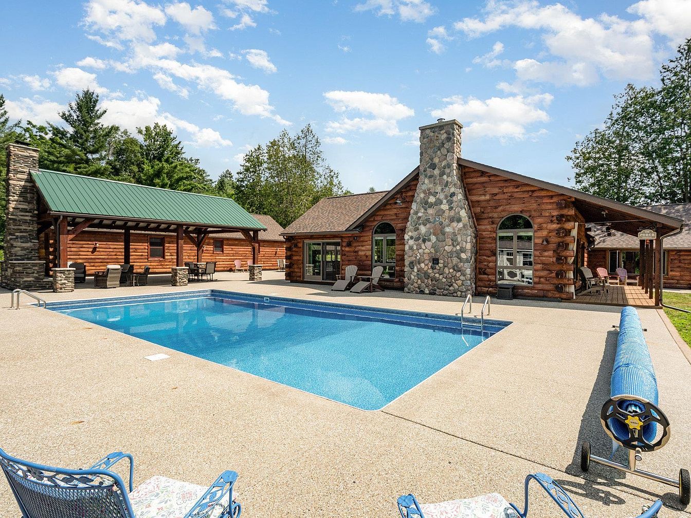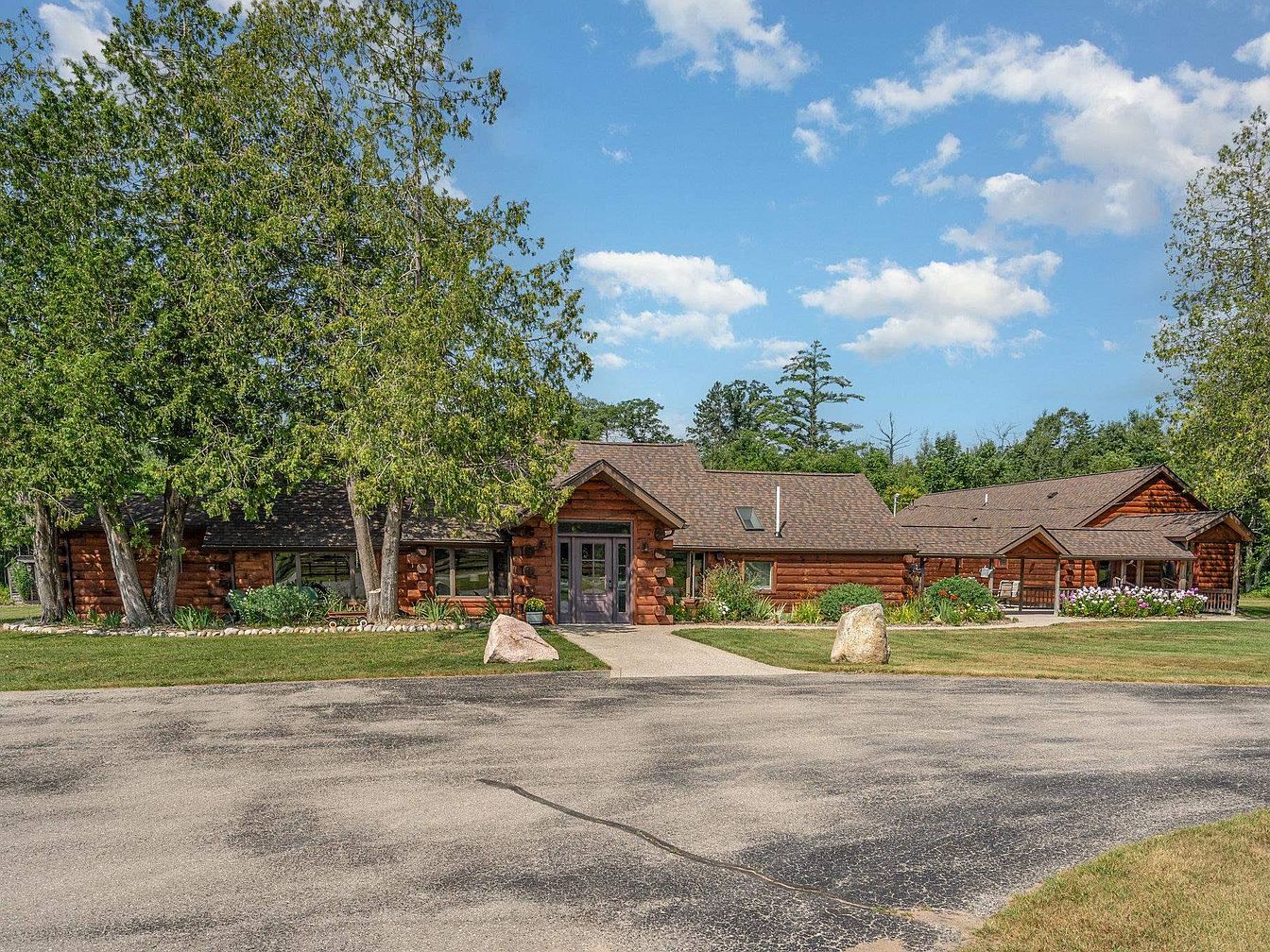 This remarkable century home, situated in Glennie, Michigan, is an original 1920s log residence that sits at the heart of a private 220+ acre estate surrounded by the Huron National Forest. Exemplifying rustic log cabin architecture, the home retains its historical significance through natural stone fireplaces and authentic timber construction. Recently updated and joined by two guest houses—one connected via a covered walkway, another remodeled for rental or caretaker use—the estate now offers over 6,100 square feet of living area. Modern amenities include heated in-ground pool, multiple barns, workshops, and backup generators. With a listing price of $1,890,000, the estate includes extensive outbuildings, maintained trails, and exclusive privacy, making it an extraordinary offering rarely found on such a grand scale.