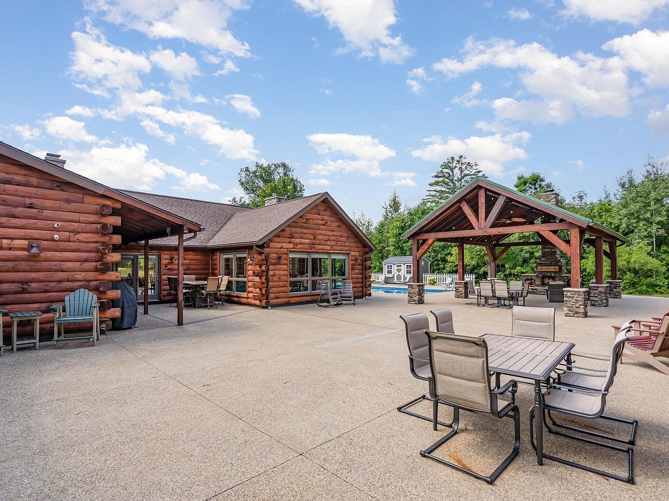 A spacious outdoor patio featuring a log cabin exterior with warm wooden tones and natural textures. The central area is finished in light textured concrete, offering ample room for multiple seating arrangements. Several sets of outdoor chairs and tables in neutral hues are arranged for dining and socializing. An open-air pavilion constructed from substantial timber beams and stone columns houses additional seating and a large stone fireplace. Tall trees and manicured shrubbery line the background, creating a lush, private setting. Large windows and glass doors on the cabin enhance the connection between indoor and outdoor spaces, blending rustic charm with casual comfort.